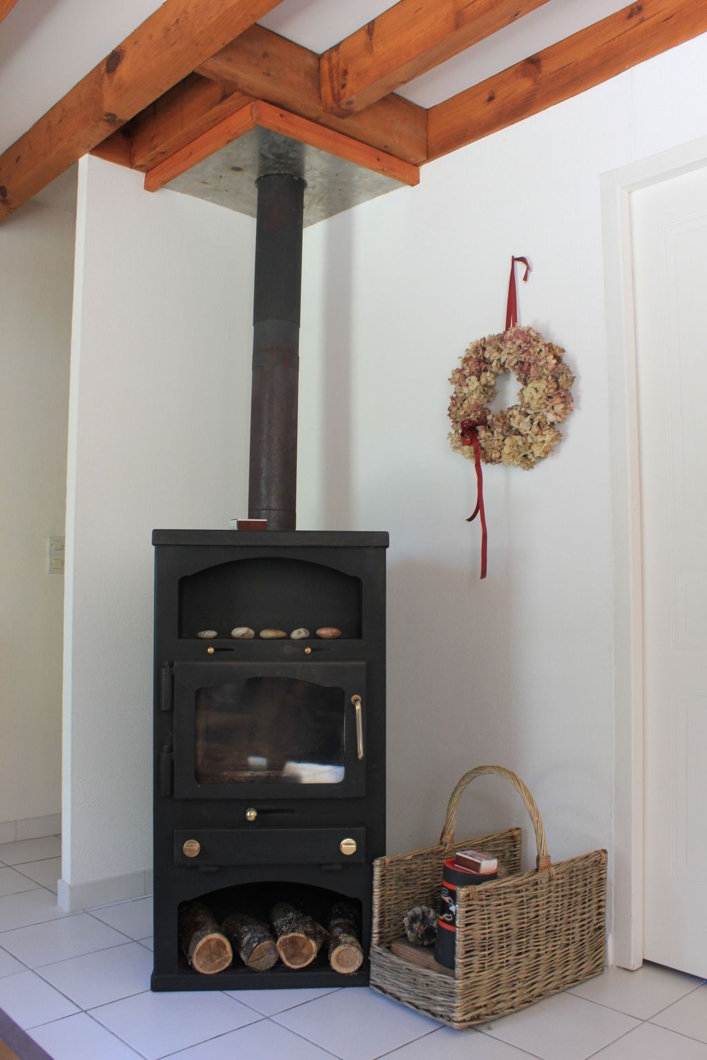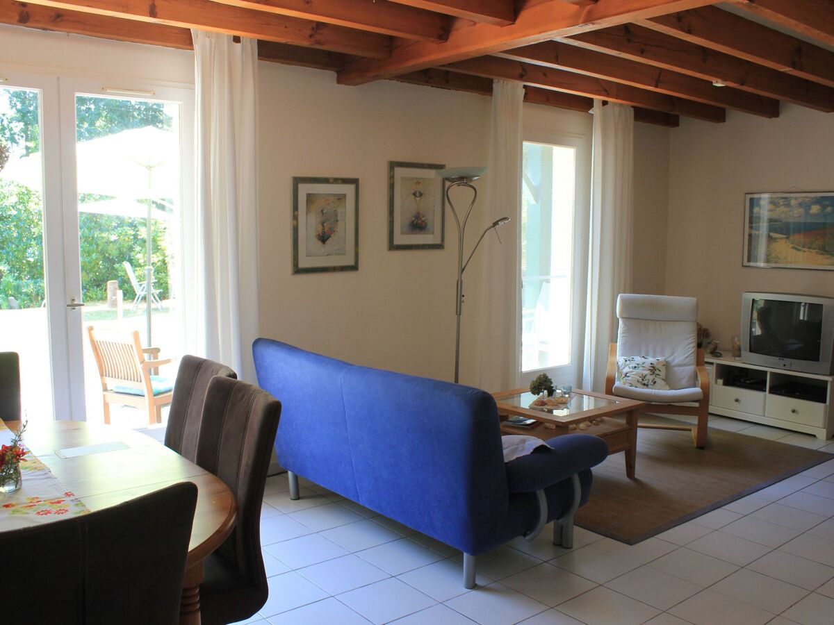 Le salon confortable s'ouvre sur le jardin et vous invite à passer des soirées relaxantes avec son canapé, son poêle à bois et sa télévision.