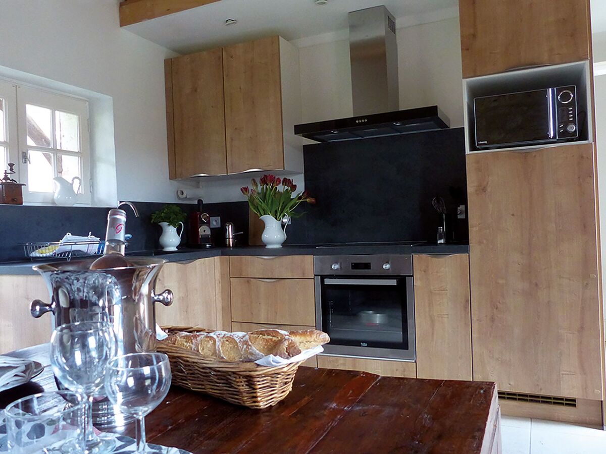 In the tower room upstairs there is a double bed (200 x 180 cm), below it a bedroom with two single beds (190 x 90 cm), the living room with adjoining kitchen is generously sized for 4 people and has a large dining table for 6 people.