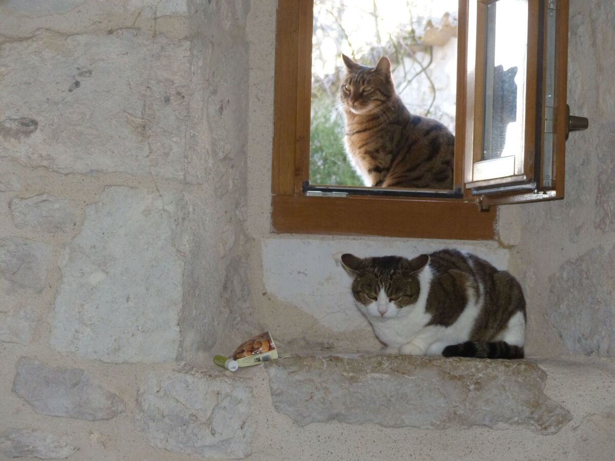 On our private zoo on the farm there are 2 dogs (a large Great Dane and a French special mix), they are all very affectionate and friendly, the 7 cats keep their distance, the 6 peacocks romp around the farm and retreat to the oak trees at night and the donkeys are either in the stable or in the pasture, they are also very affectionate and trusting.