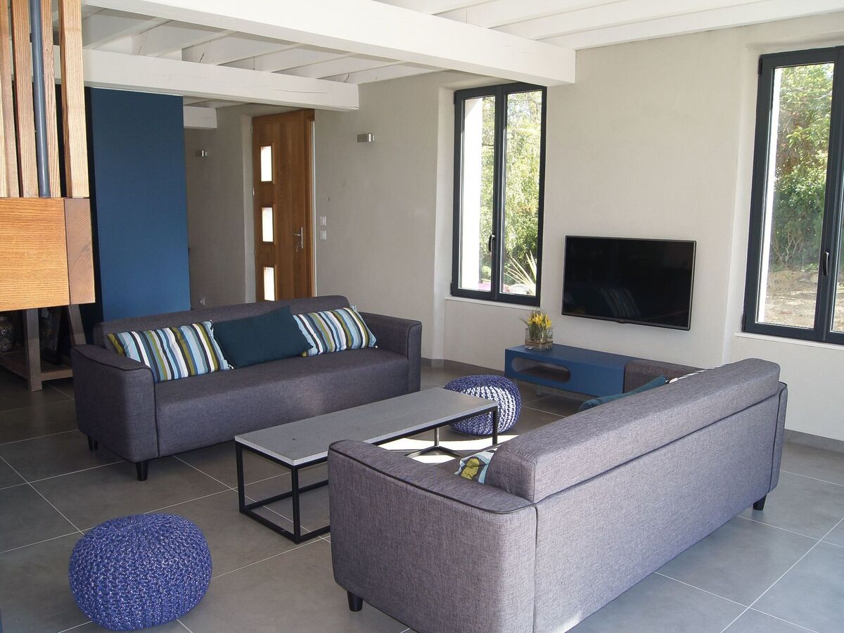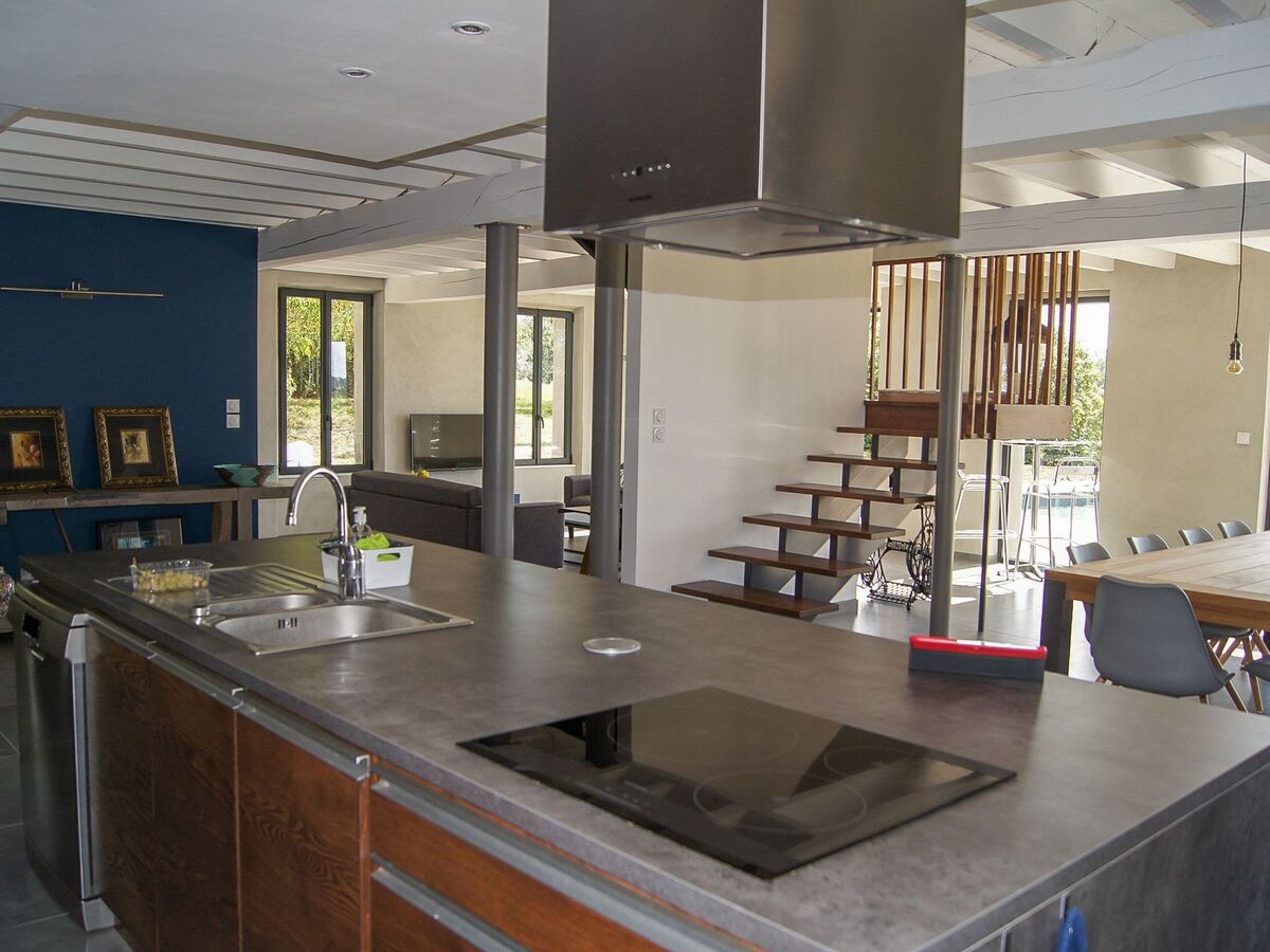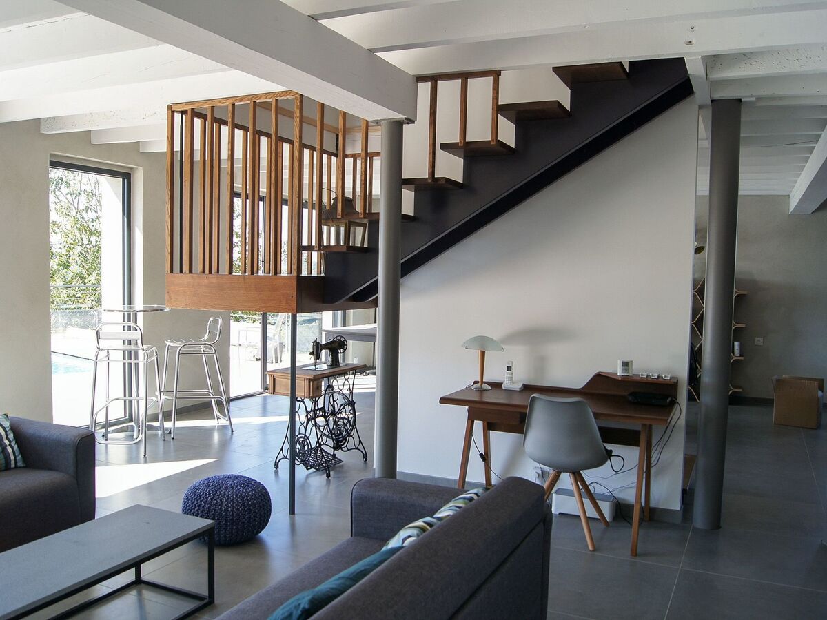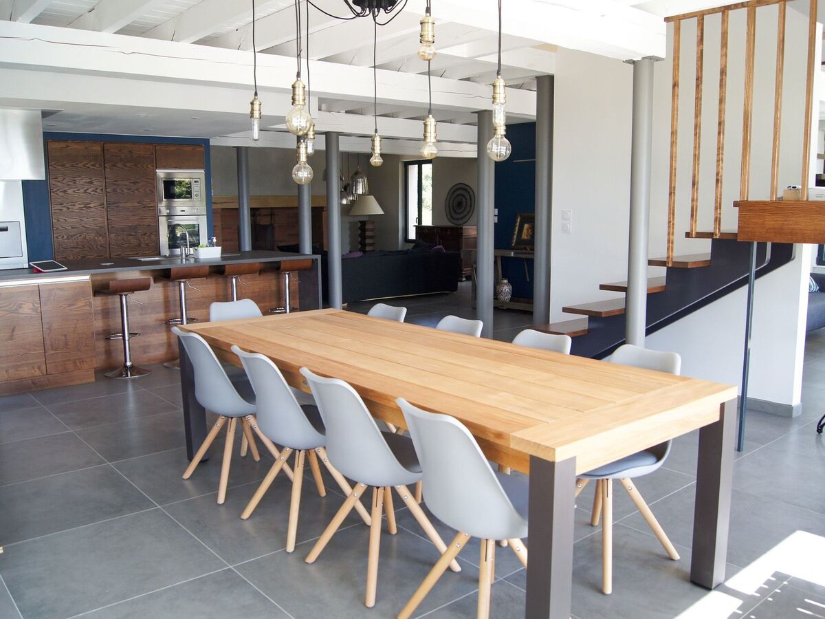 Les grandes baies vitrées illuminent l'espace et offrent une transition fluide vers la terrasse et la piscine, intégrant l'extérieur à la vie quotidienne de la maison.