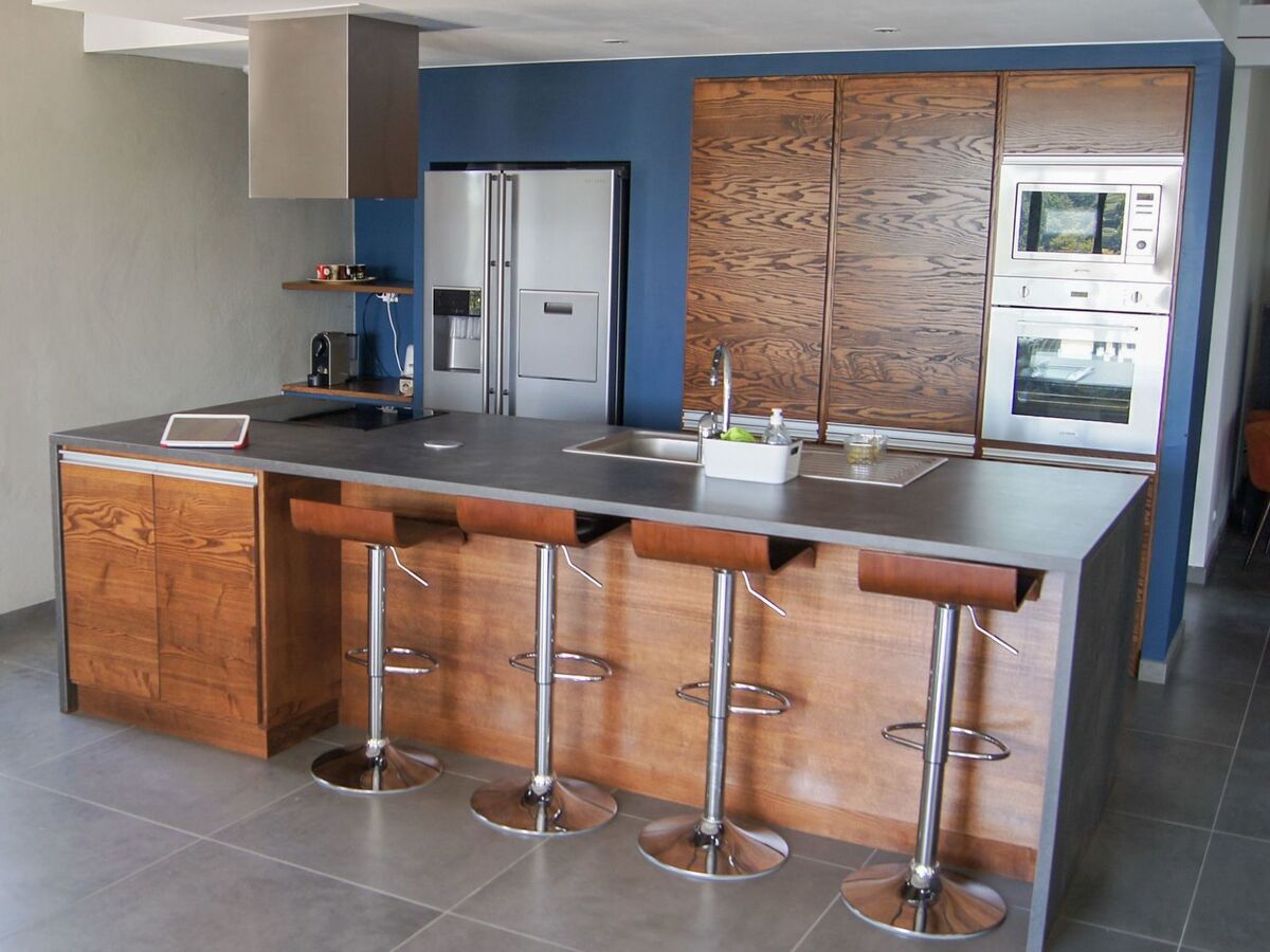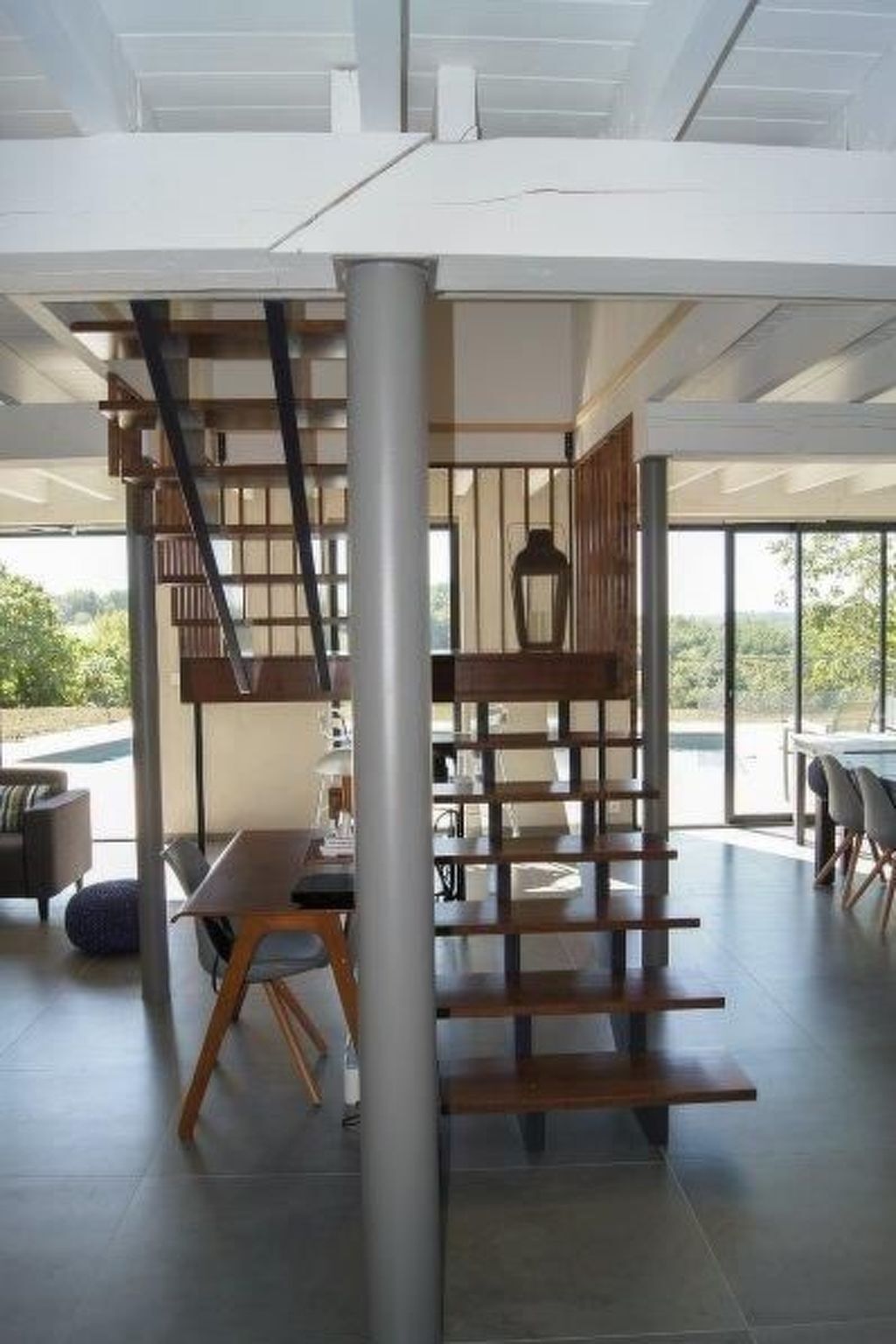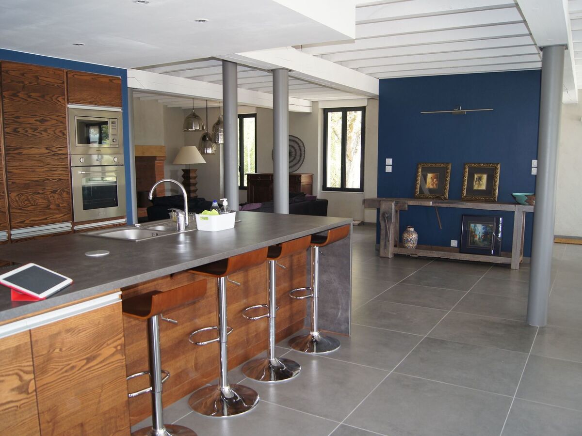 Les grandes baies vitrées illuminent l'espace et offrent une transition fluide vers la terrasse et la piscine, intégrant l'extérieur à la vie quotidienne de la maison.