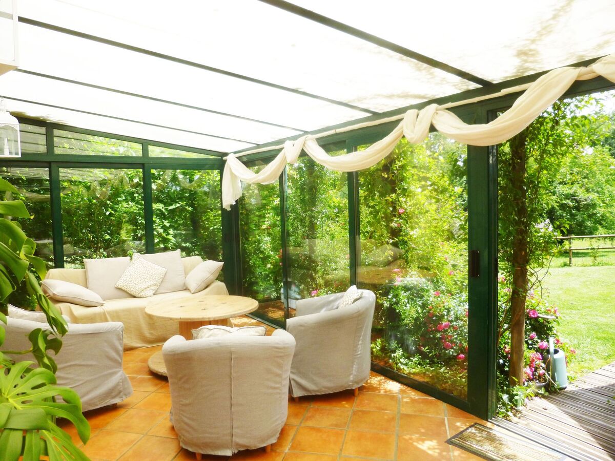 À l'extérieur, la véranda vitrée invite à des repas en plein air avec une vue imprenable sur le jardin.