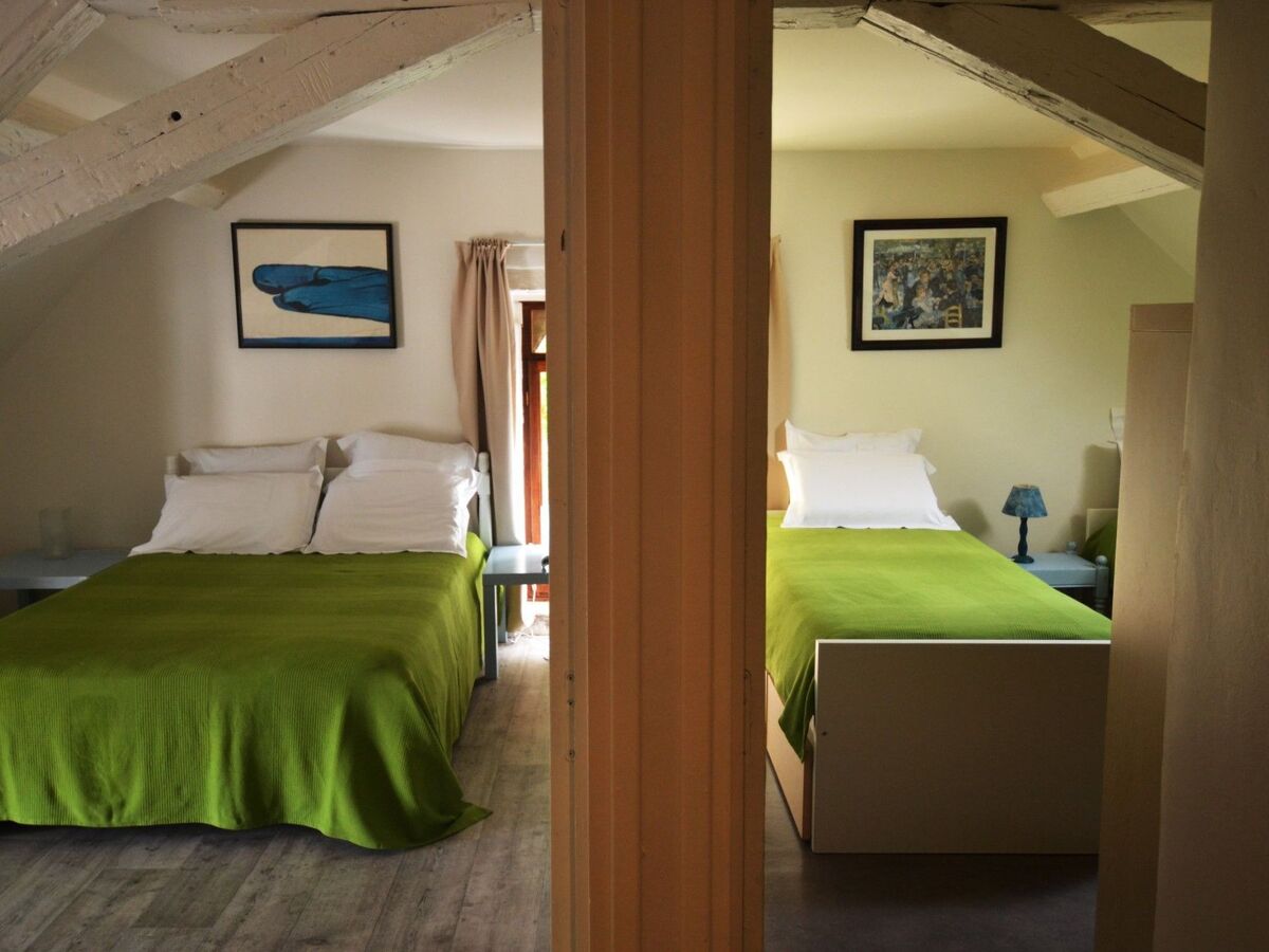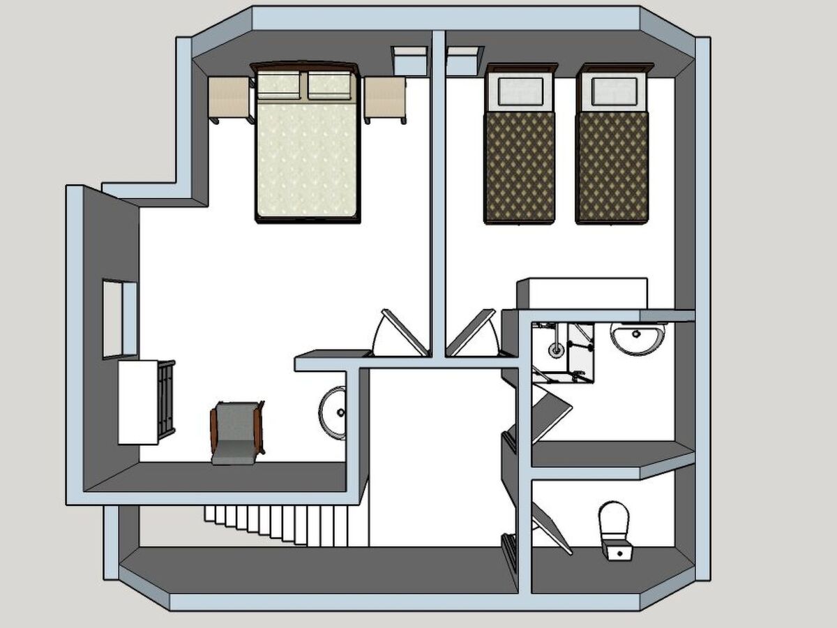 The upper floor has a bedroom with a double bed and a bedroom with two single beds, as well as a separate toilet and a bathroom with a shower and a sink.