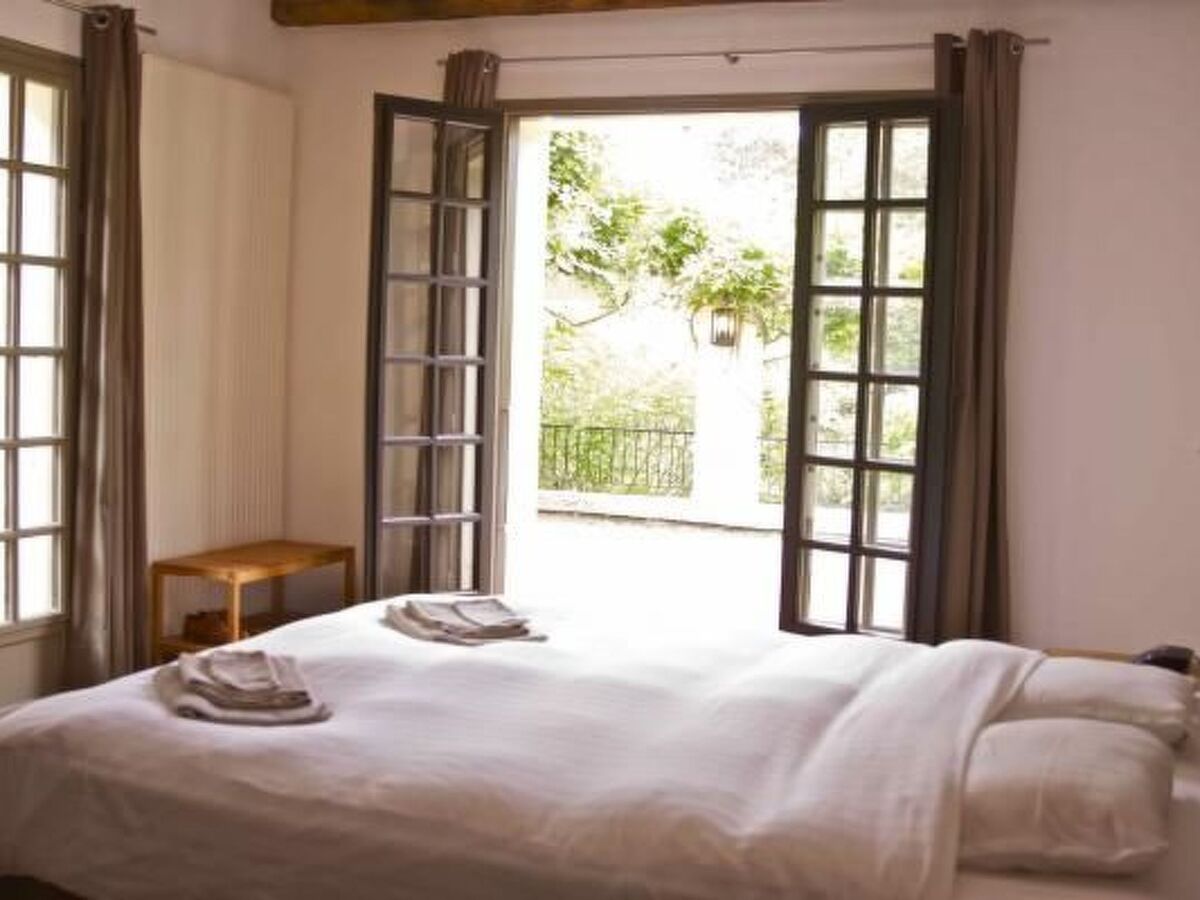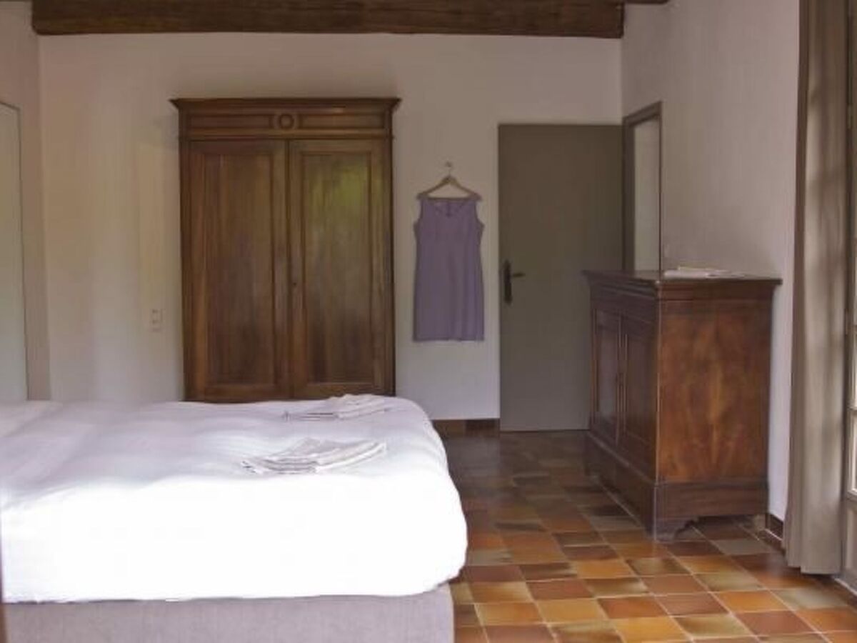 The bedroom on the ground floor has a double bed (2m wide) with large doors opening onto the terrace.