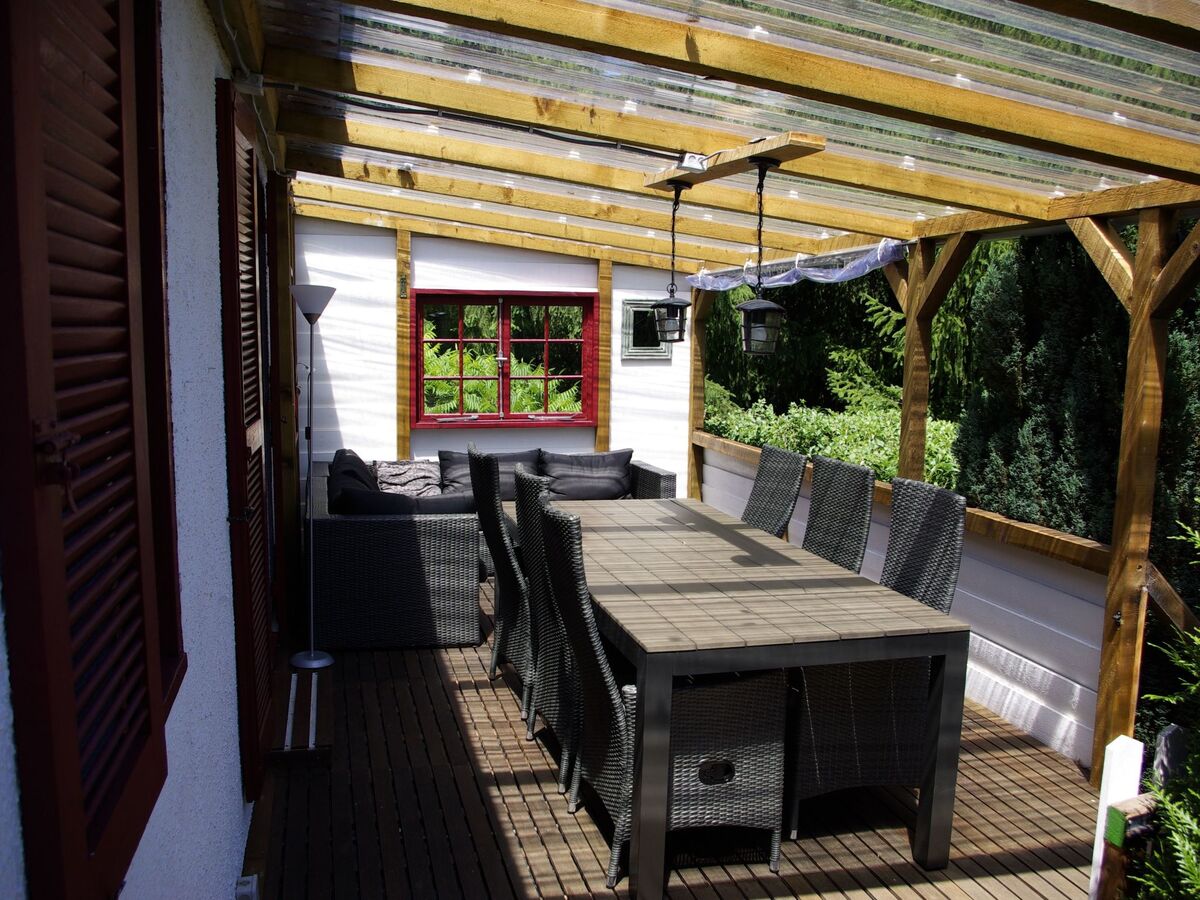 For cooler days, there is a covered terrace with dining table and lounge sofa.