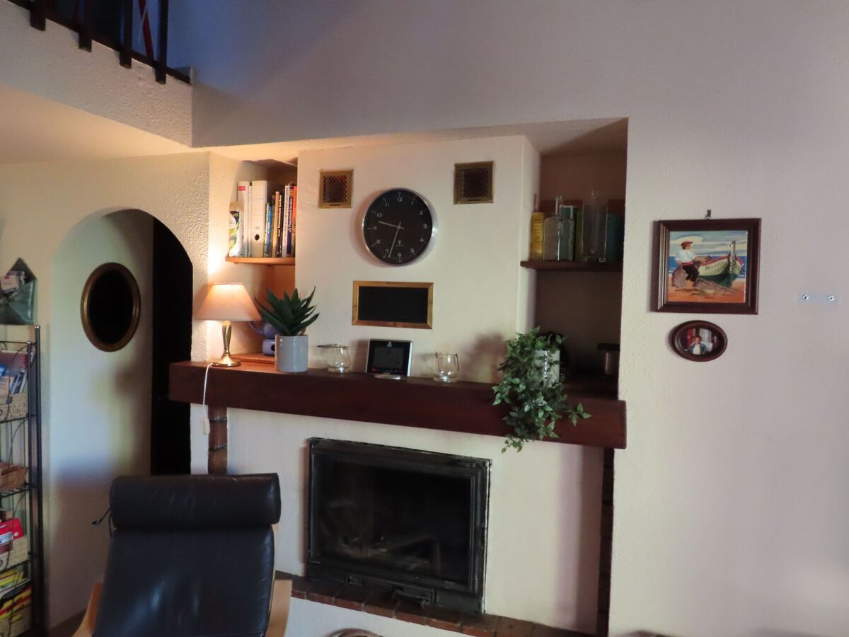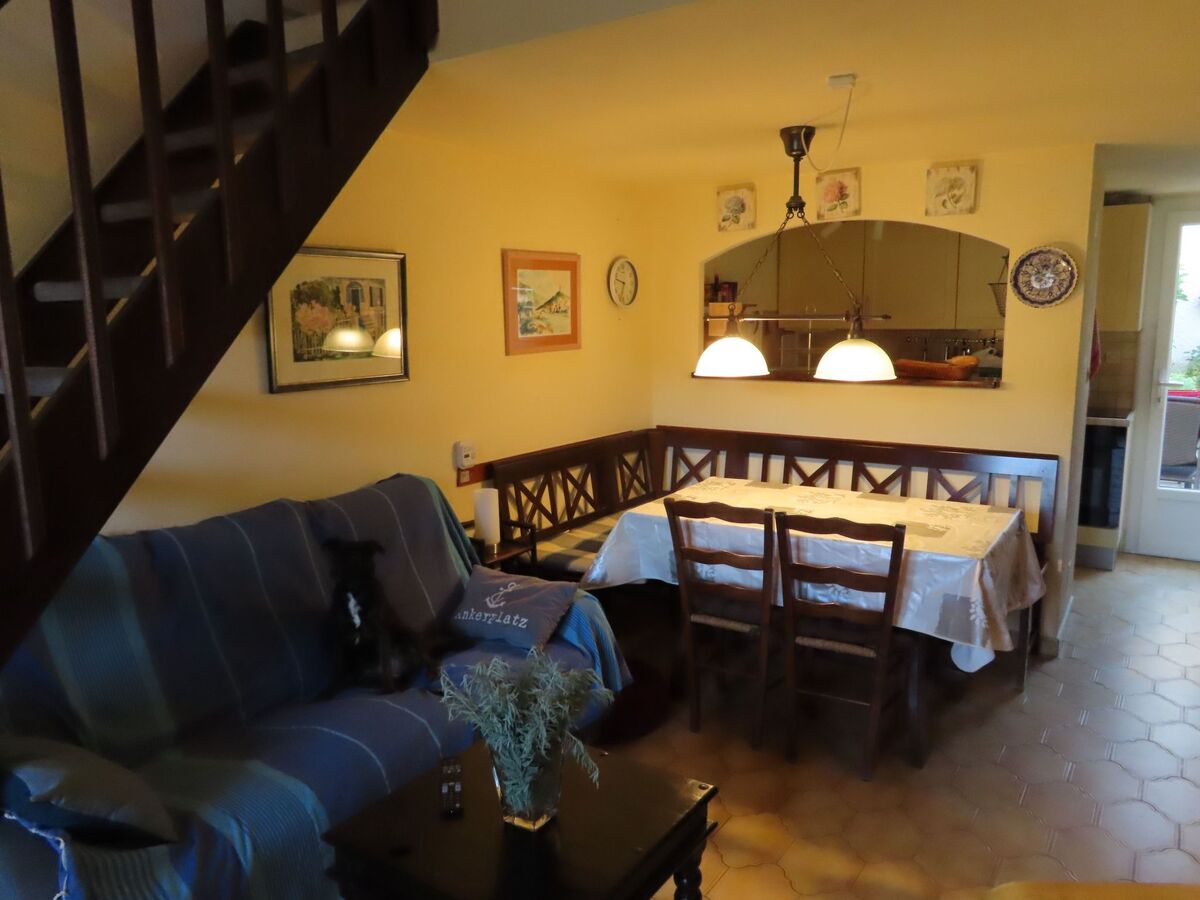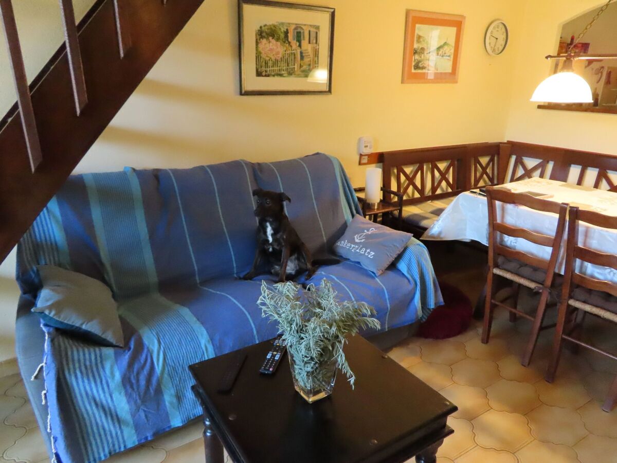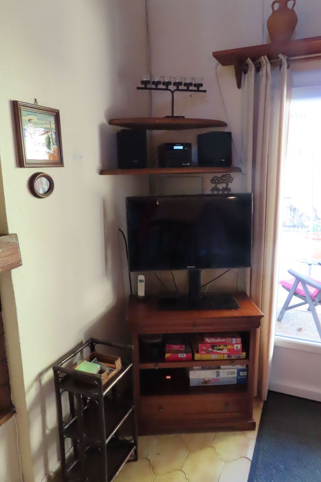 La cuisine semi-ouverte jouxte le salon/salle à manger avec une banquette et des chaises, ainsi qu'un canapé et un fauteuil, la télévision par satellite (Astra) ainsi que la télévision par Internet (Orange), une chaîne hi-fi, un téléphone, un ventilateur.