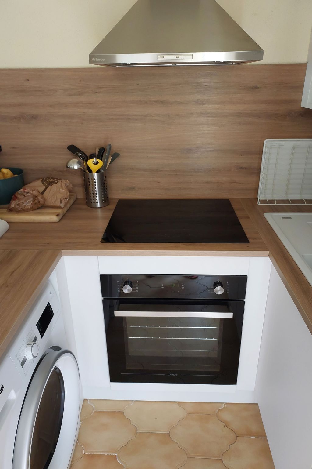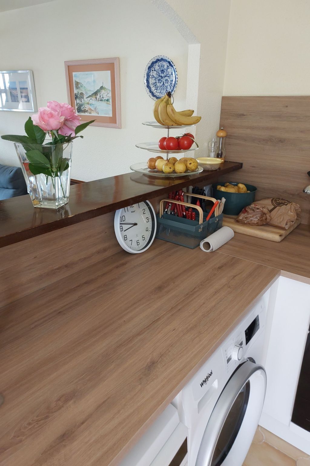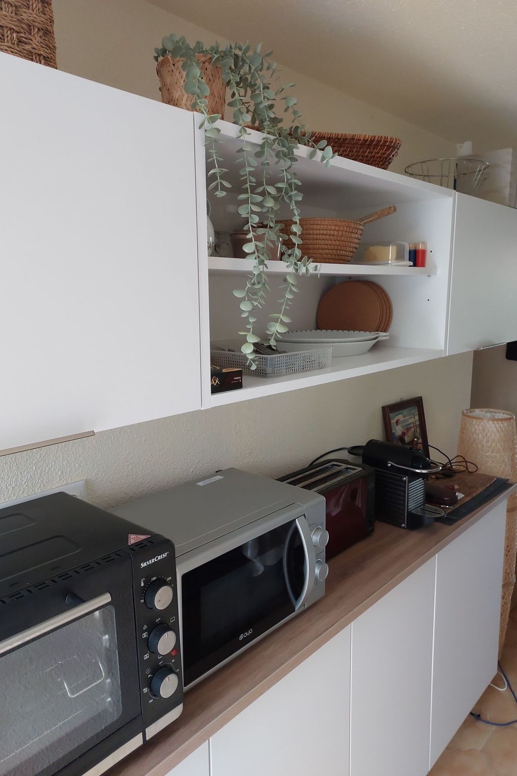 La cuisine semi-ouverte jouxte le salon/salle à manger avec une banquette et des chaises, ainsi qu'un canapé et un fauteuil, la télévision par satellite (Astra) ainsi que la télévision par Internet (Orange), une chaîne hi-fi, un téléphone, un ventilateur.