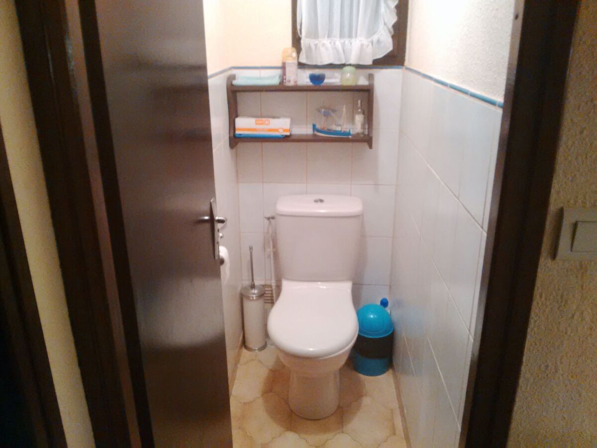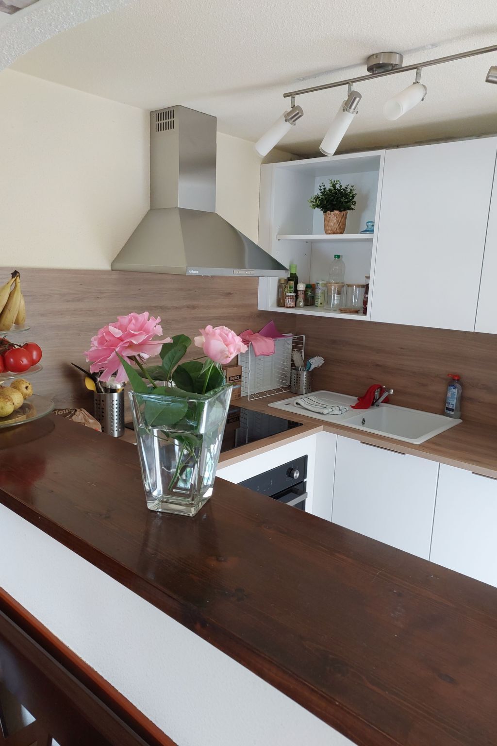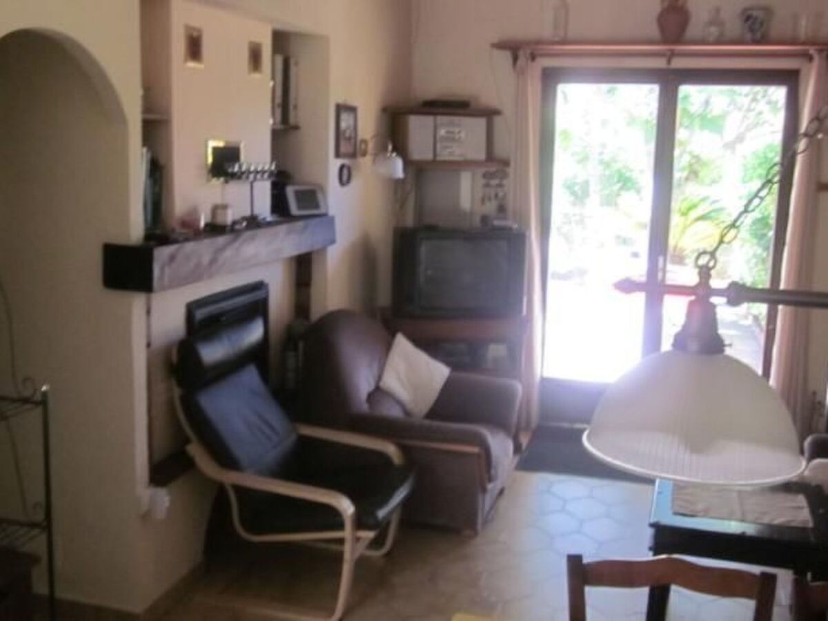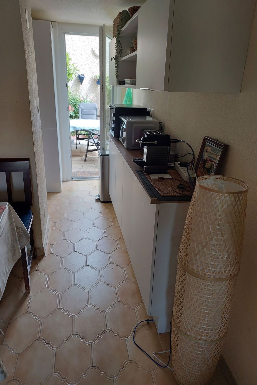 La cuisine semi-ouverte jouxte le salon/salle à manger avec une banquette et des chaises, ainsi qu'un canapé et un fauteuil, la télévision par satellite (Astra) ainsi que la télévision par Internet (Orange), une chaîne hi-fi, un téléphone, un ventilateur.