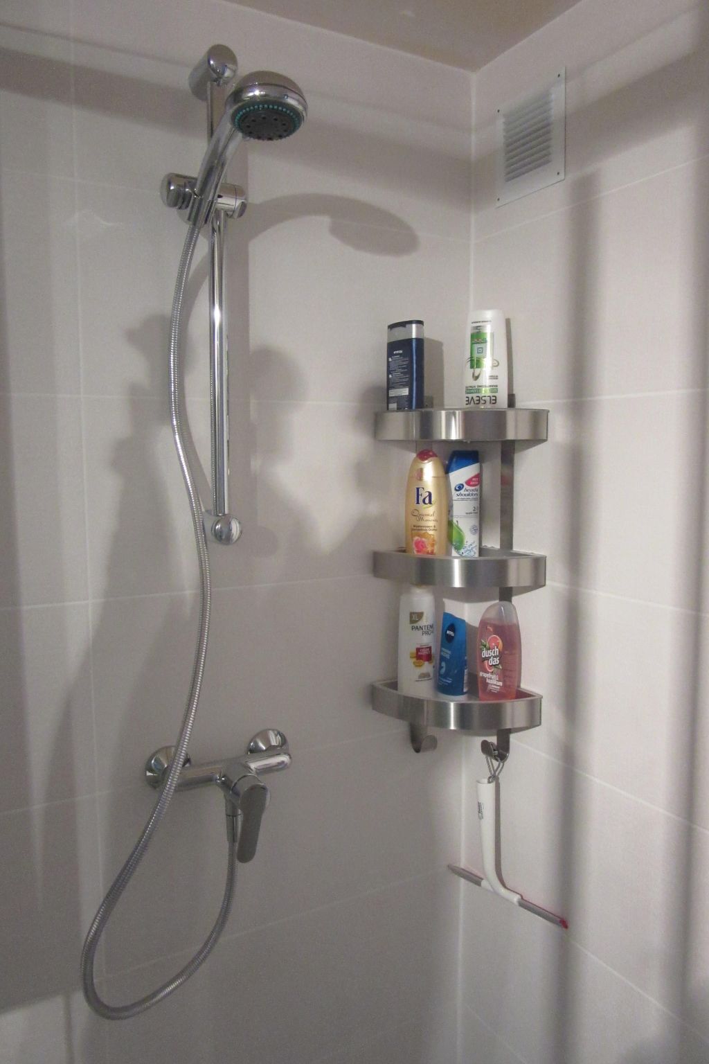 La salle de bain, rénovée en 2016, est équipée d'une grande douche, d'un lavabo et d'un sèche-cheveux.