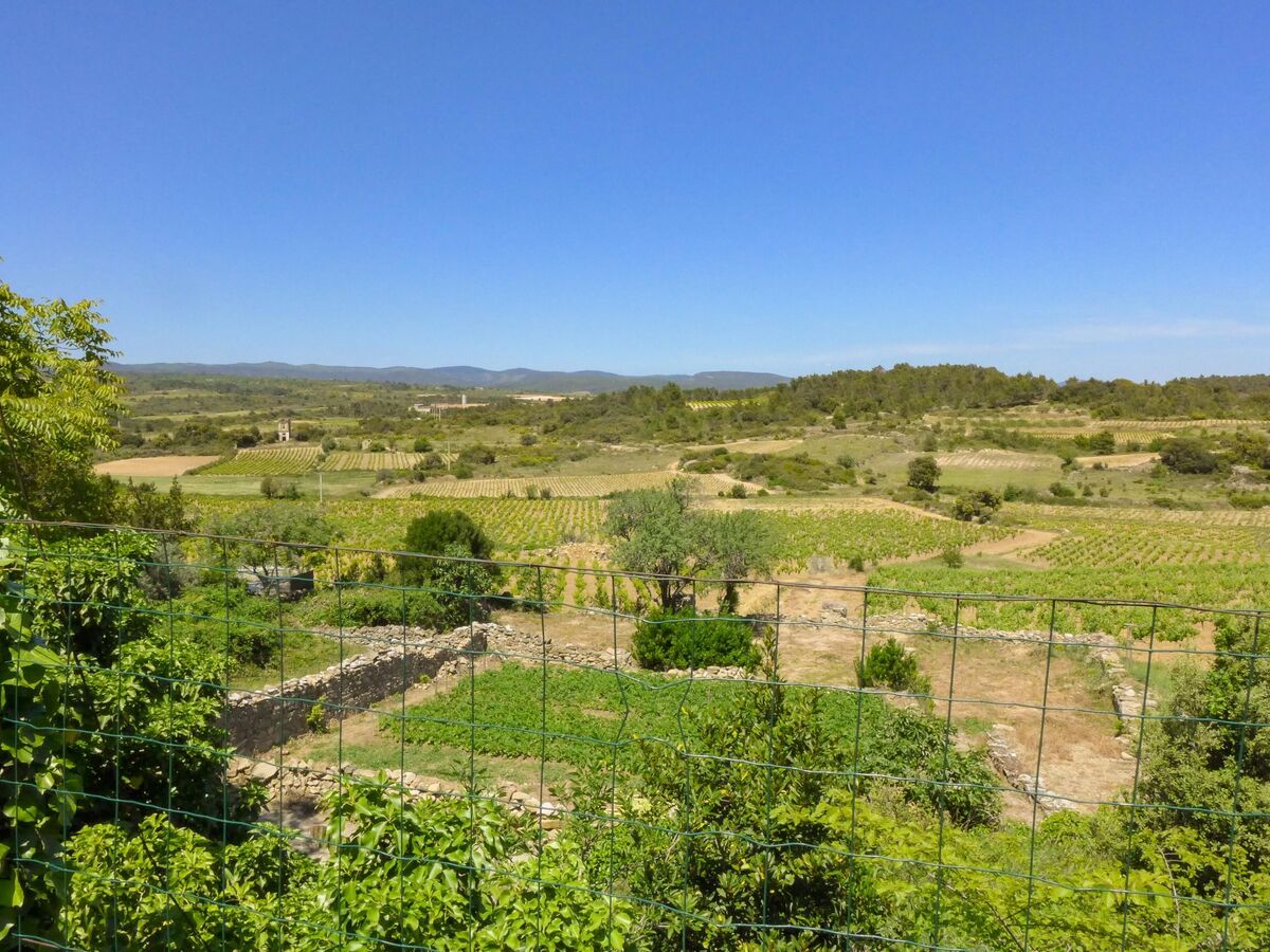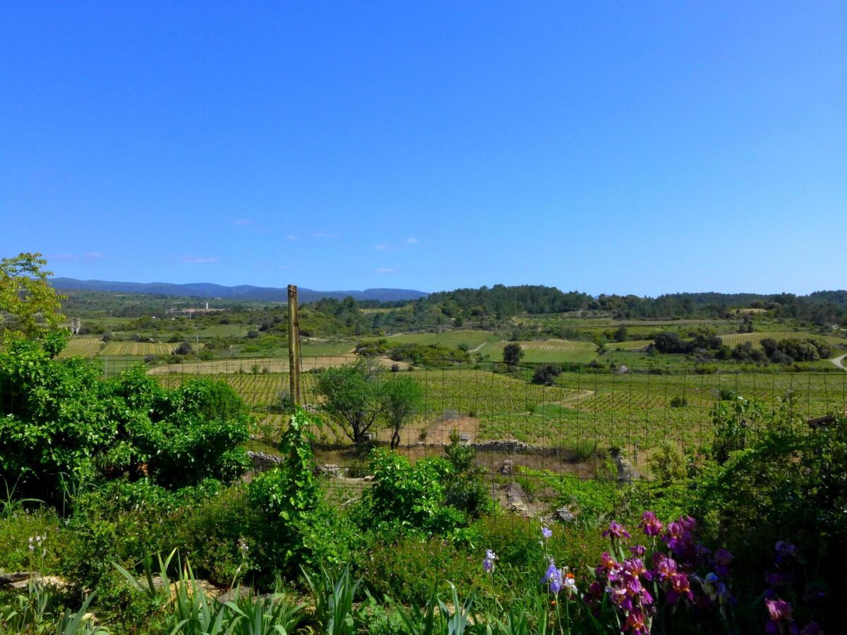 Vue panoramique du jardin sur les collines du Minervois.
