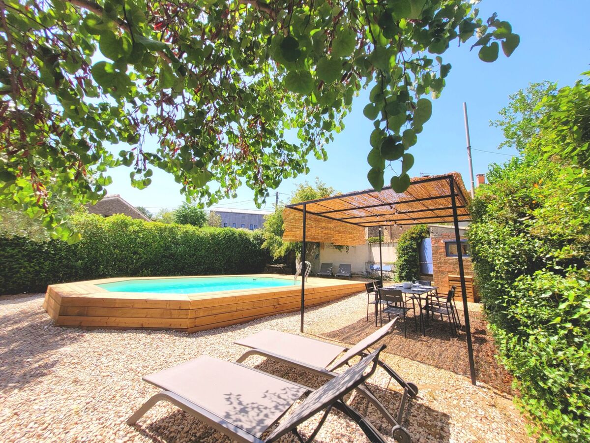 Autour de cette piscine semi enterrée de 5m X 3m, solarium avec transats et salon de jardin.
