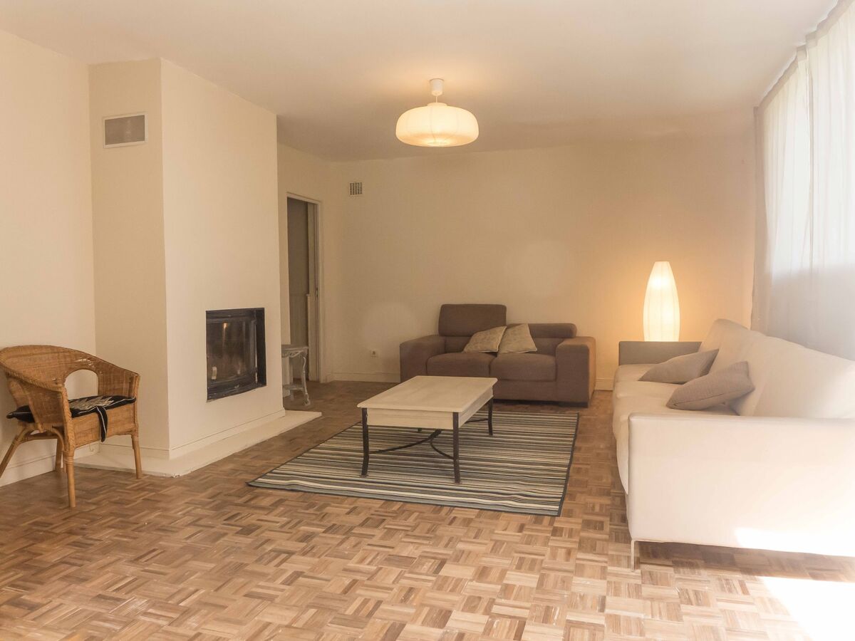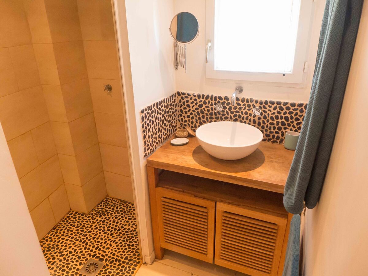Elle dispose d'un jardin privatif de 600 m² clôturé, agrémenté d'une grande terrasse couverte et d'une piscine aménagée avec ces plages en bois.