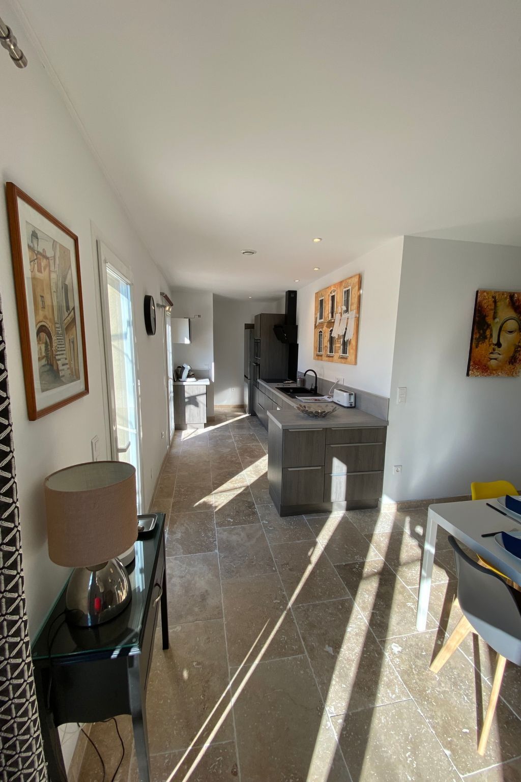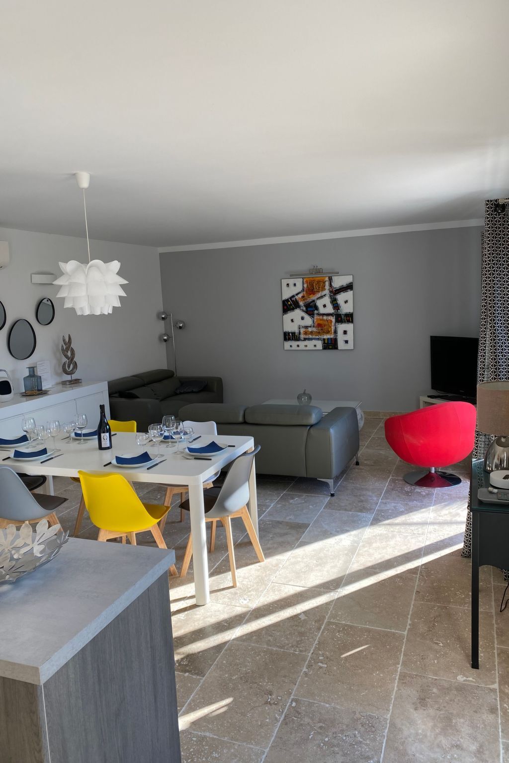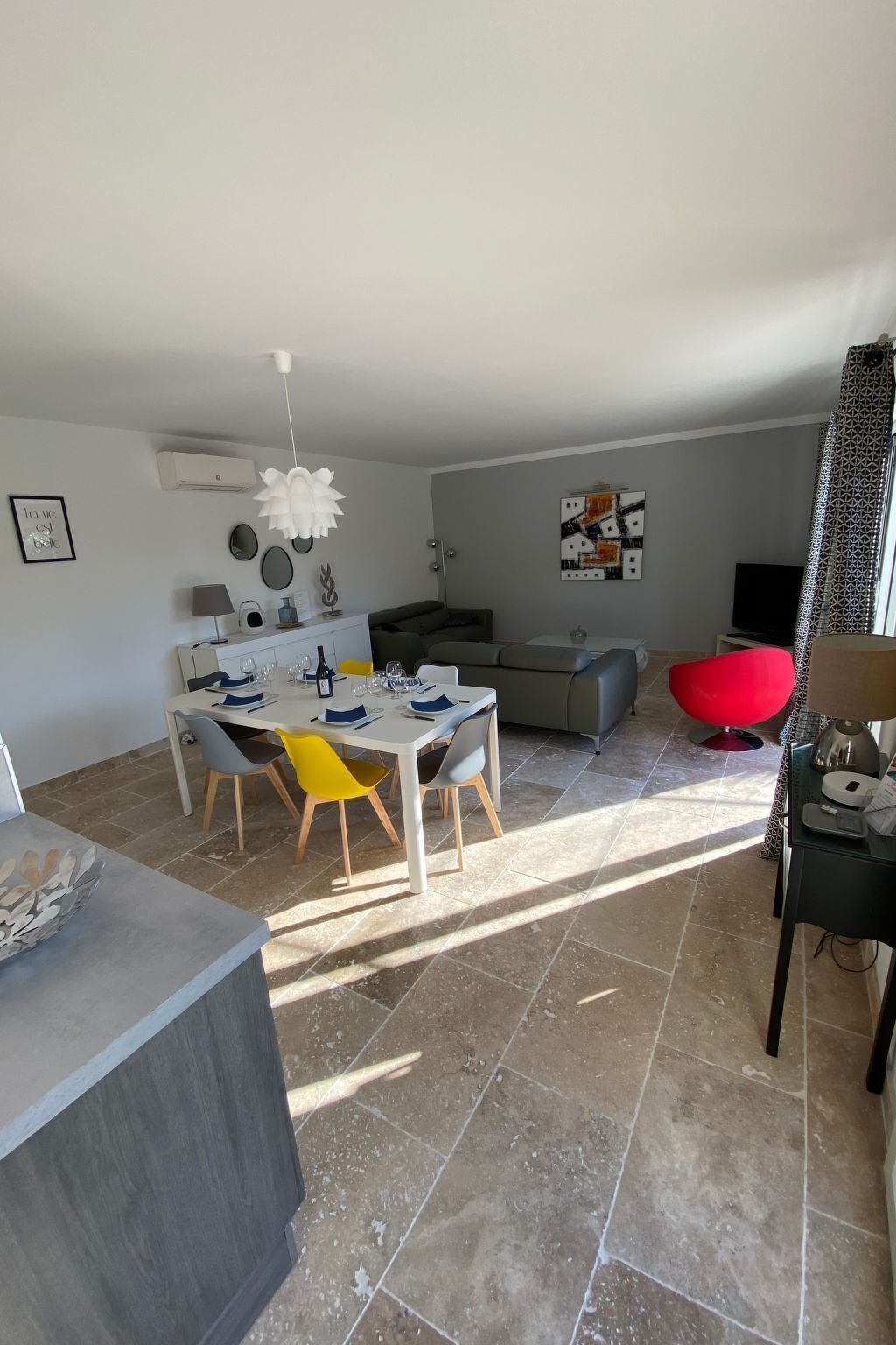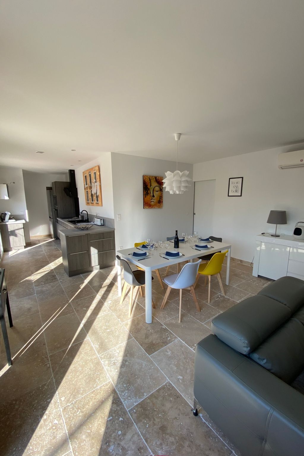 Villa neuve de 100 m2 de plein pied pour 6 personnes : cuisine américaine, salle à manger-salon ouvrant sur la terrasse couverte et la piscine, 1 suite parentale avec douche et vasque (lit double 160 cm), 1 chambre (lit double 160 cm) 1 chambre avec lit double en 160 cm, salle de bain, Villa climatisée dans la partie jour (cuisine, salle à manger et salon)