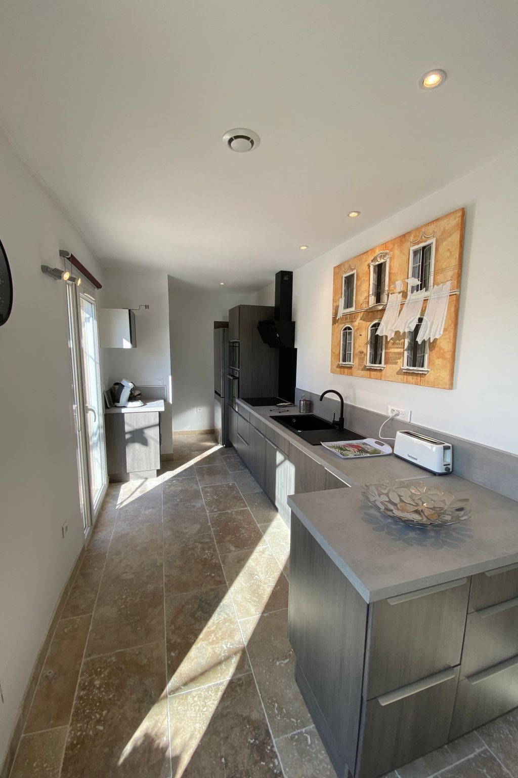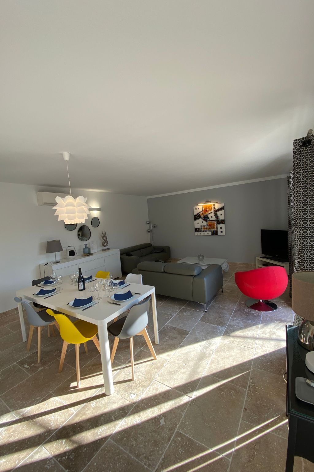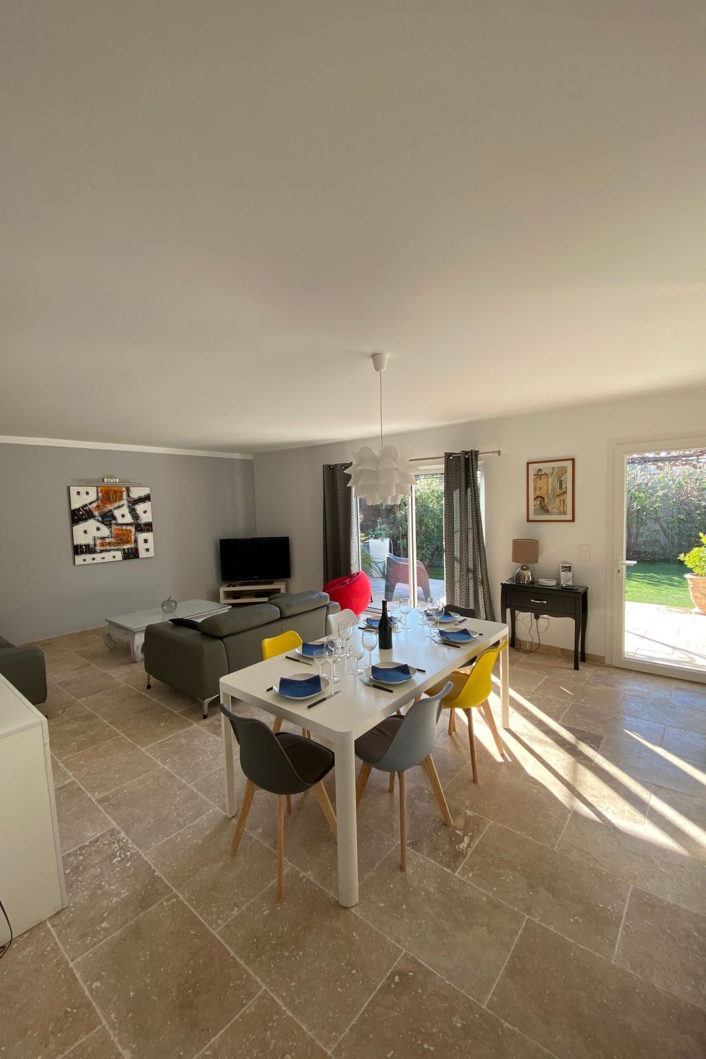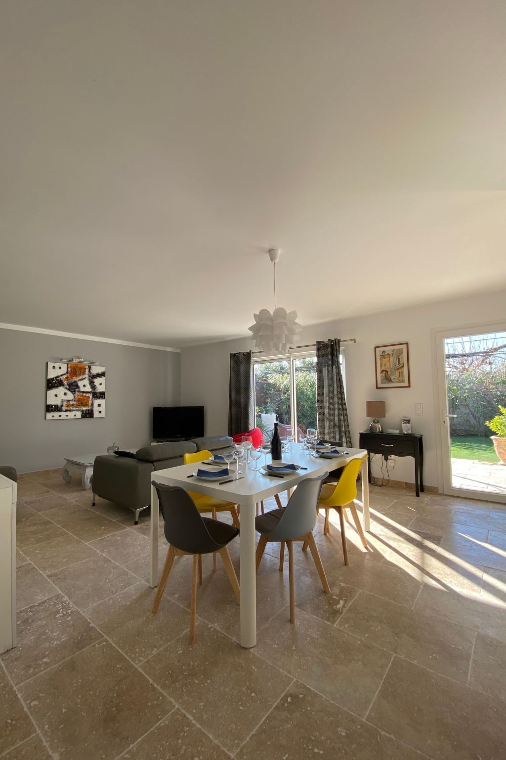 Villa neuve de 100 m2 de plein pied pour 6 personnes : cuisine américaine, salle à manger-salon ouvrant sur la terrasse couverte et la piscine, 1 suite parentale avec douche et vasque (lit double 160 cm), 1 chambre (lit double 160 cm) 1 chambre avec lit double en 160 cm, salle de bain, Villa climatisée dans la partie jour (cuisine, salle à manger et salon)