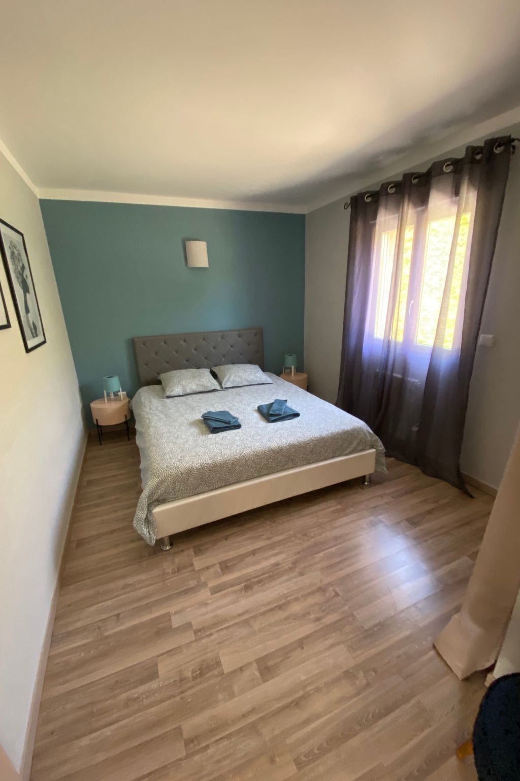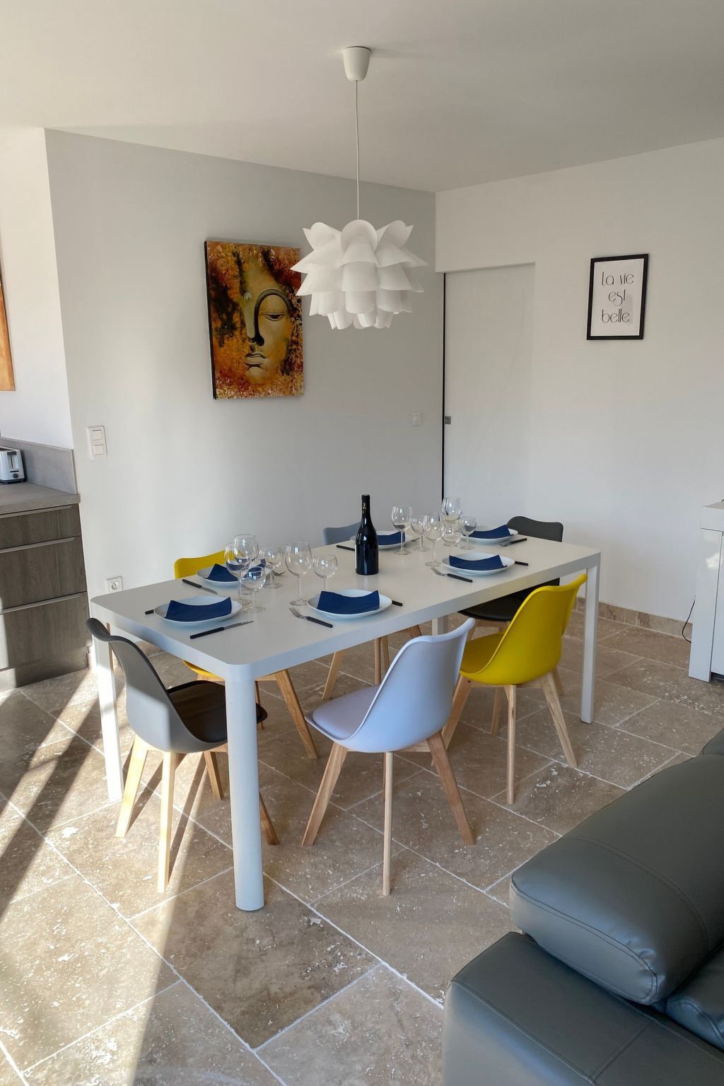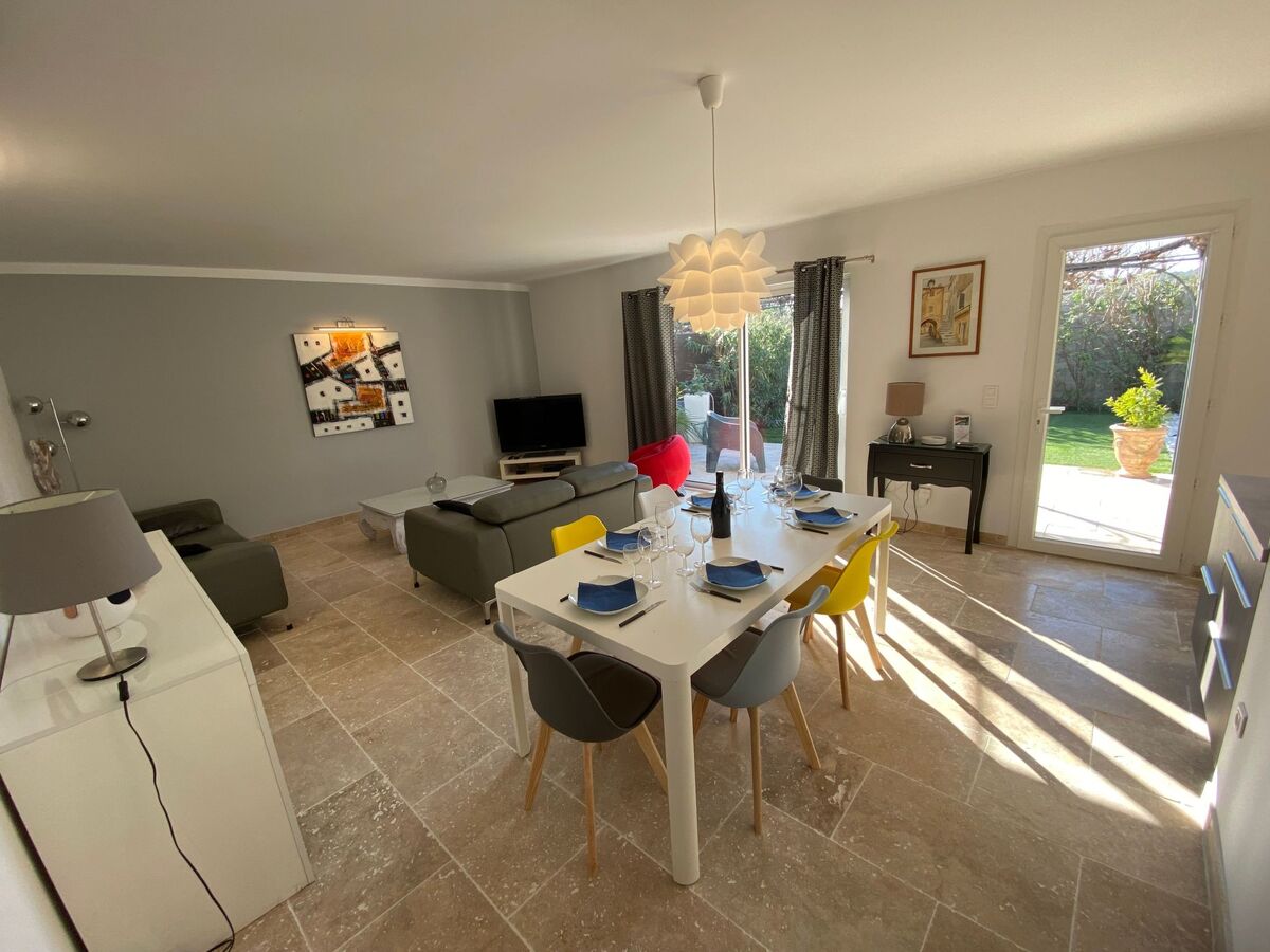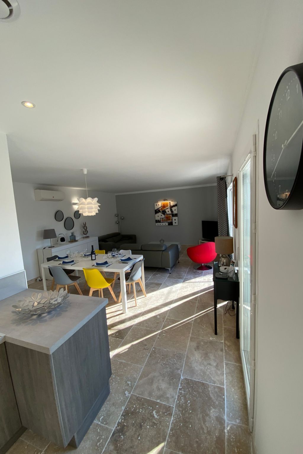 Villa neuve de 100 m2 de plein pied pour 6 personnes : cuisine américaine, salle à manger-salon ouvrant sur la terrasse couverte et la piscine, 1 suite parentale avec douche et vasque (lit double 160 cm), 1 chambre (lit double 160 cm) 1 chambre avec lit double en 160 cm, salle de bain, Villa climatisée dans la partie jour (cuisine, salle à manger et salon)