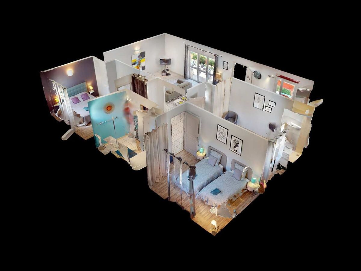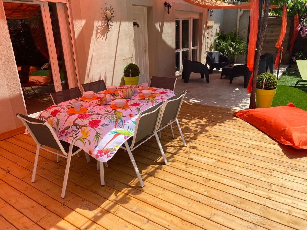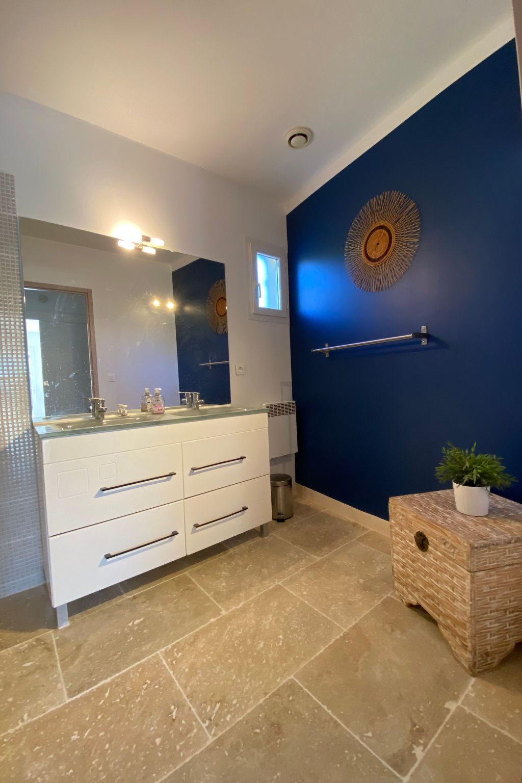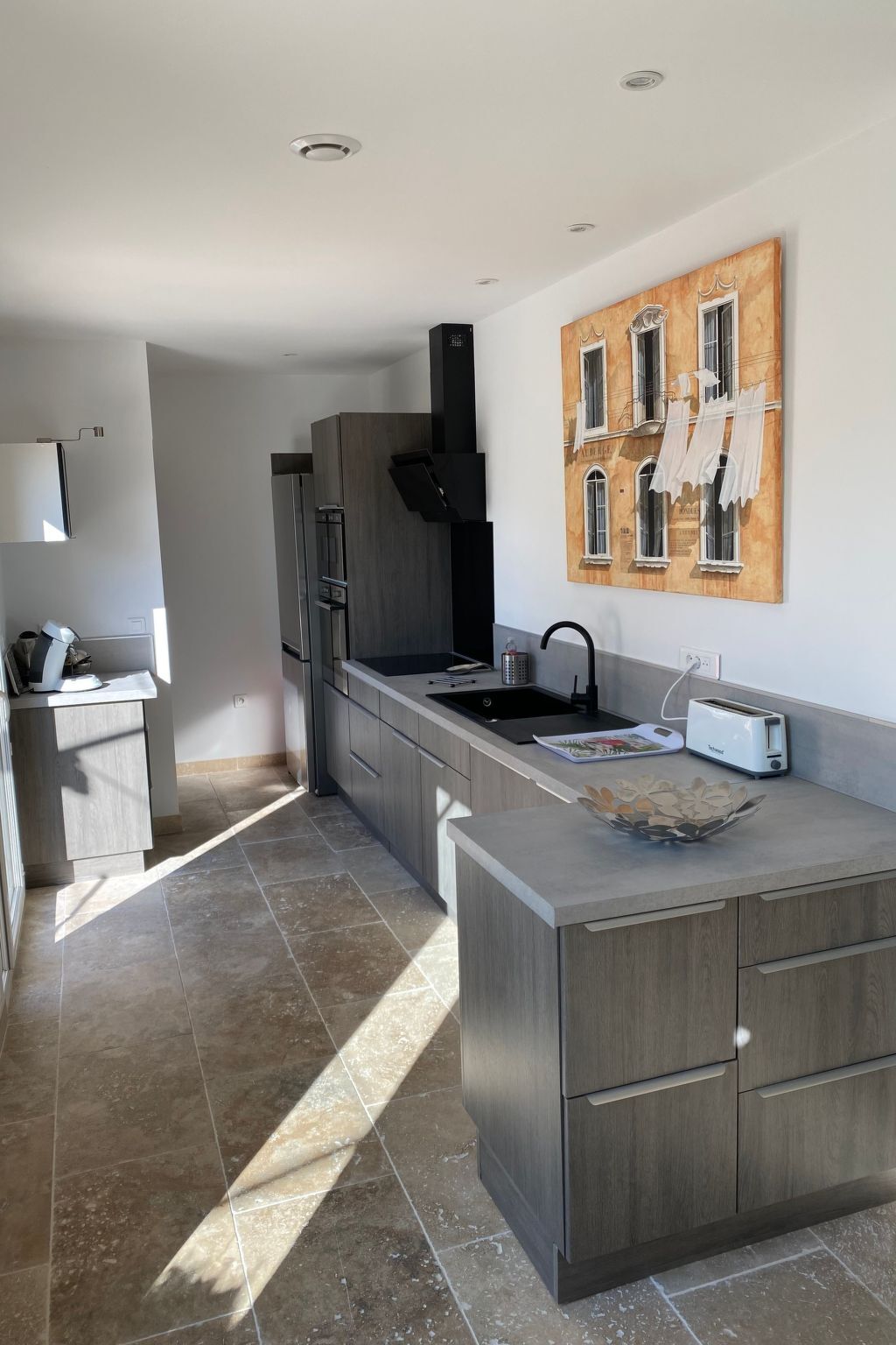 Villa neuve de 100 m2 de plein pied pour 6 personnes : cuisine américaine, salle à manger-salon ouvrant sur la terrasse couverte et la piscine, 1 suite parentale avec douche et vasque (lit double 160 cm), 1 chambre (lit double 160 cm) 1 chambre avec lit double en 160 cm, salle de bain, Villa climatisée dans la partie jour (cuisine, salle à manger et salon)