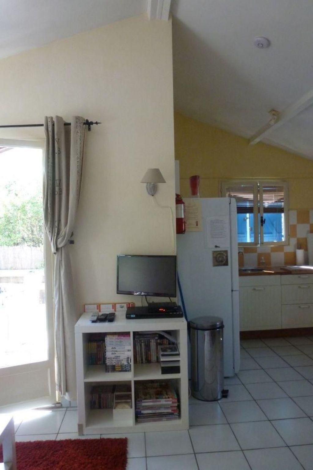 In the kitchen there is a corner kitchen unit with carousel cabinet and drawers (utensils), sink, gas cooker, fridge/freezer, kitchen island (drawers) breakfast bar and 4 chairs (extra chairs are under the bed in the bedroom), crockery cupboard, cooking pots, frying pans, frying pans, wok, grill pan, deep fryer, food processor, sandwich maker, mixer, gourmet set, microwave oven, Senseo.