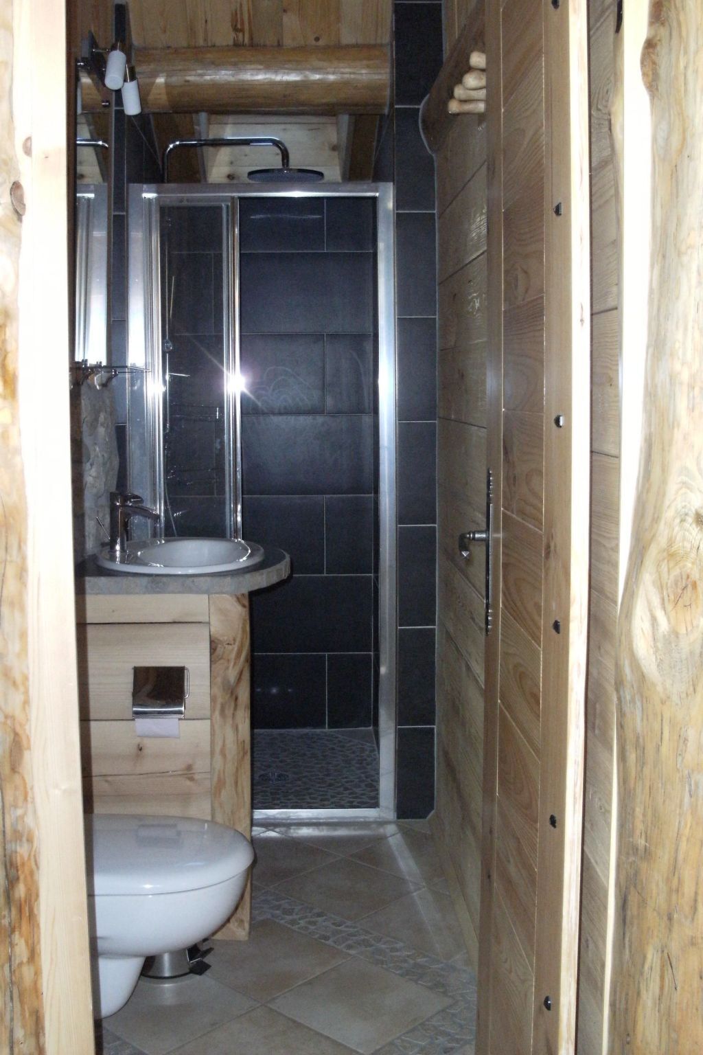 La salle de bain équipée de toilettes, lavabo, douche de plain-pied se trouve un demi-étage plus haut.