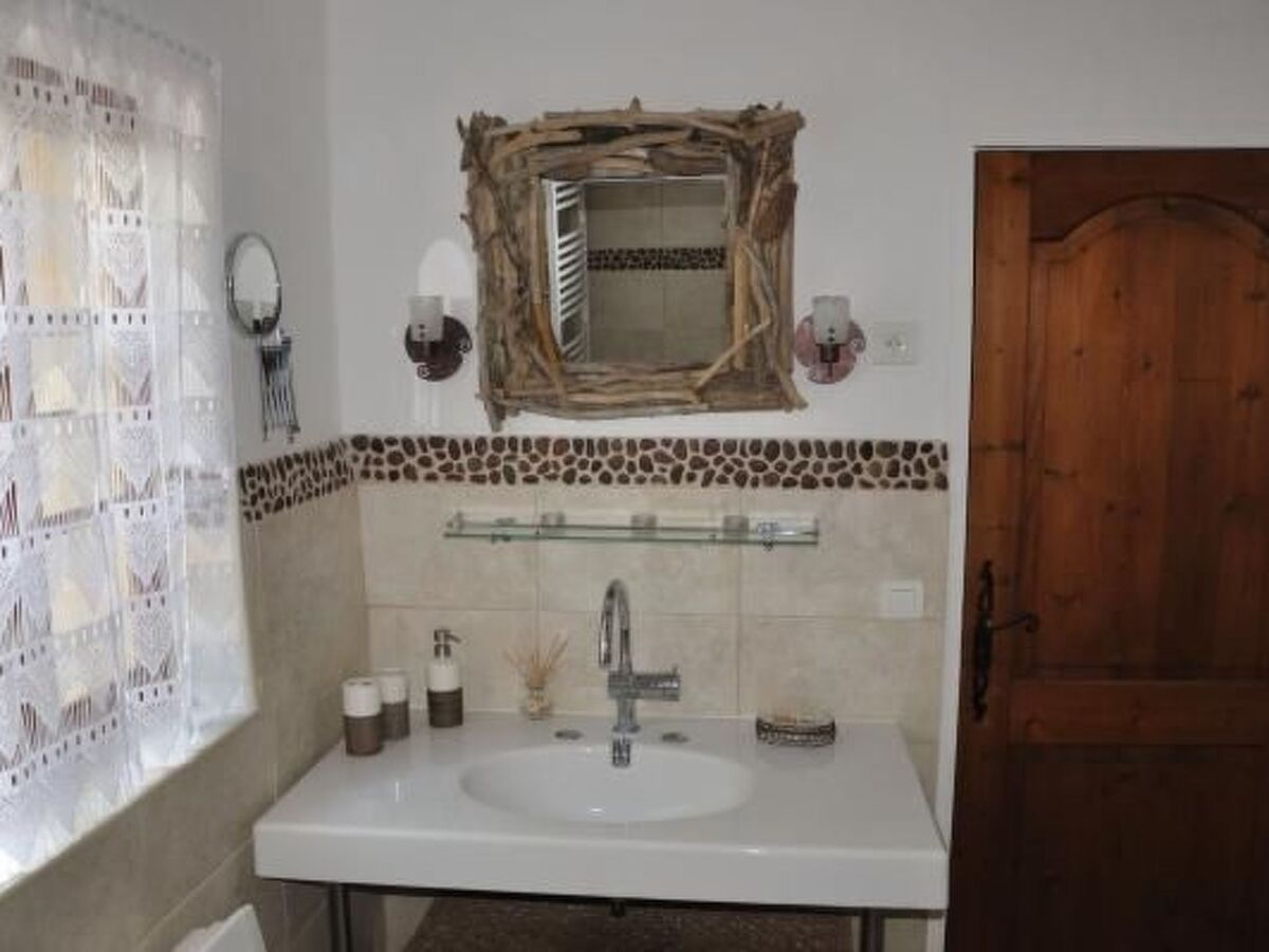 Cuisine: grande cuisine entièrement équipée avec plaque vitrocéramique, four électrique, lave-linge, réfrigérateur, congélateur, cafetière et micro-ondes Salon et salle à manger: table à manger de 180 cm de long avec 4 chaises, canapé, cheminée et chaîne stéréo, TV (TV satellite) chambre ( à l'étage par escalier intérieur): 1 lit double (160 cm), placard encastré avec étagères, tiroirs et tringle à vêtements, tout autour avec rideaux ou volets, vue lointaine au sud Salle de bain: confortablement grande et moderne salle de bain avec lavabo, baignoire et toilettes Terrasse / sièges: tables de jardin, chaises et transats sont disponibles; Barbecue couvert et couvert, piscine commune ronde (disponible pour les deux maisons de vacances, diamètre 300cm, hauteur 120cm uniquement disponible en juillet, août et septembre) Chauffage: radiateurs électriques avec thermostats dans chaque chambre Lavage / séchage: lave-linge et sèche-linge communs dans le bâtiment annexe.