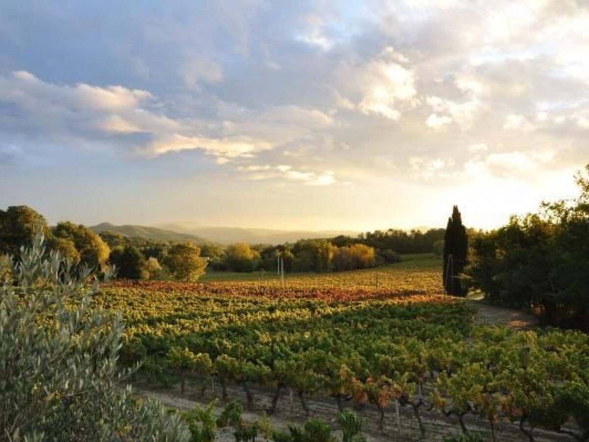 La belle maison provençale de deux étages en pierre naturelle, située sur un terrain de 1268 mètres carrés, a un charme traditionnel et rustique et une vue dégagée sur les vignes et les montagnes à l'horizon.