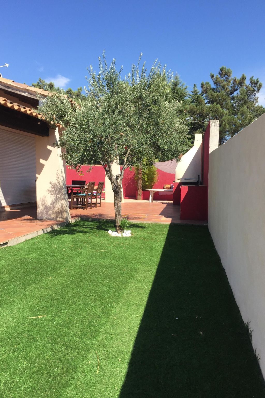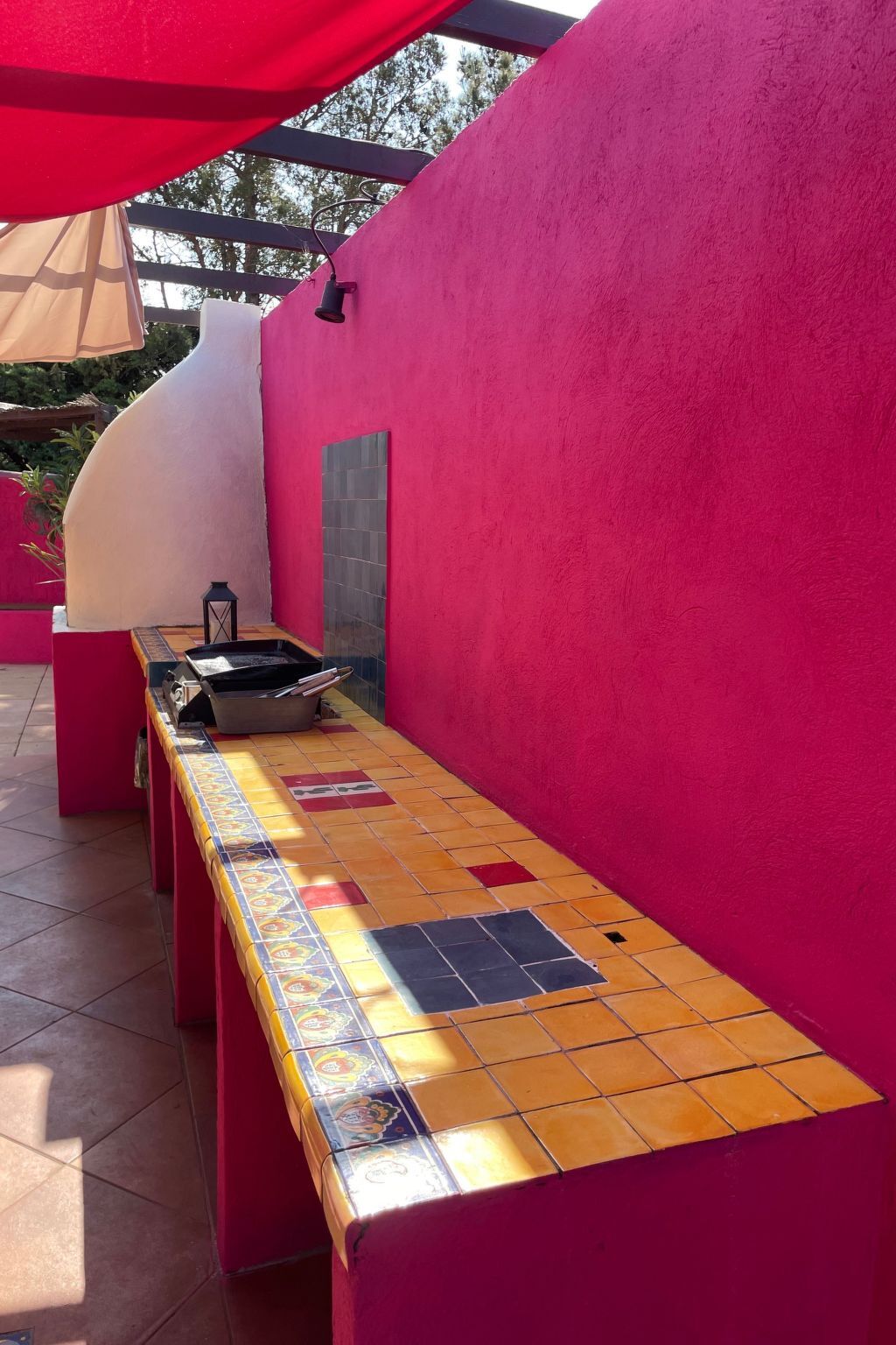 On accède par la baie vitrée de trois mètres à une terrasse carrelée agrémentée d'une cuisine d'été.