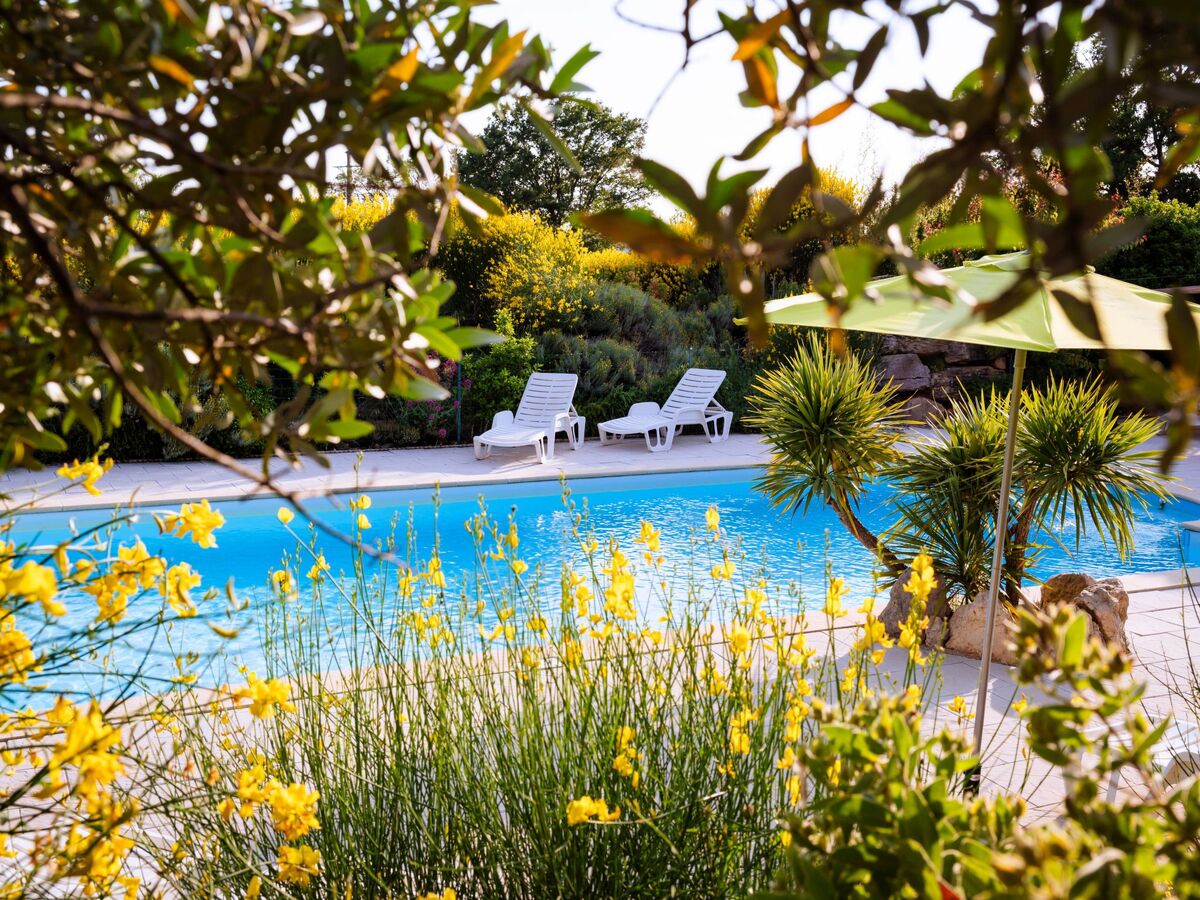 Une grande piscine (de 10m x 5m) partagée autour d'une vaste plage avec pool-house et de nombreux transats et parasols.