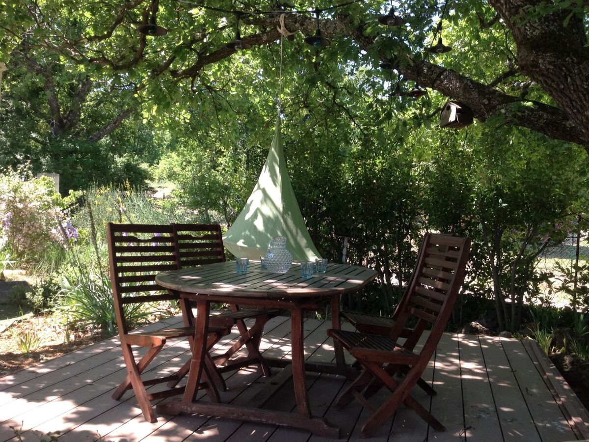 Dans le jardin, sous un grand chêne se trouve un salon de jardin ombragé qui invite à s’asseoir en groupe et à manger à l’air libre.