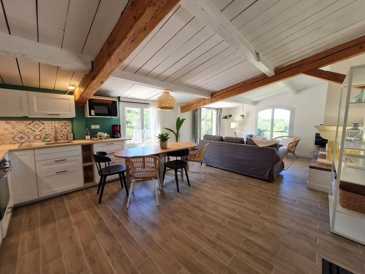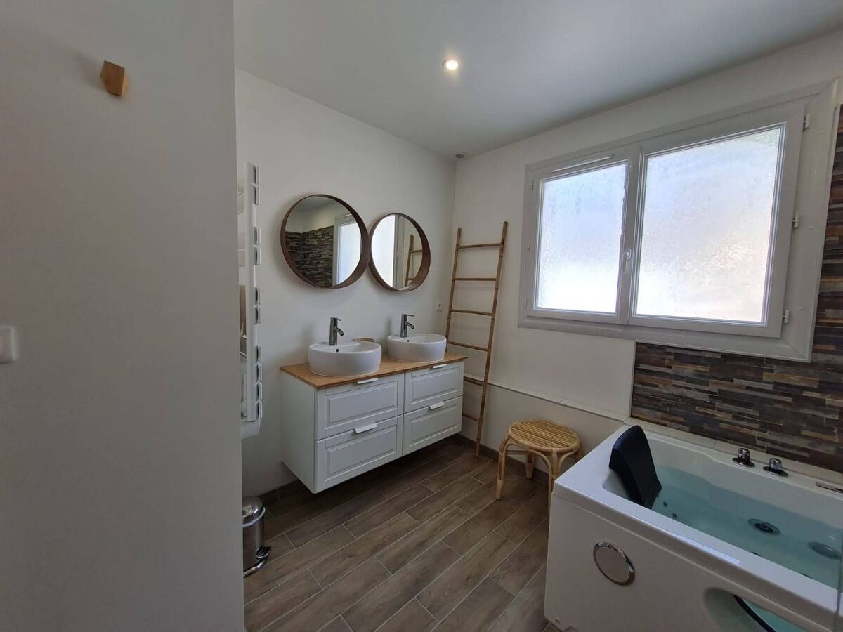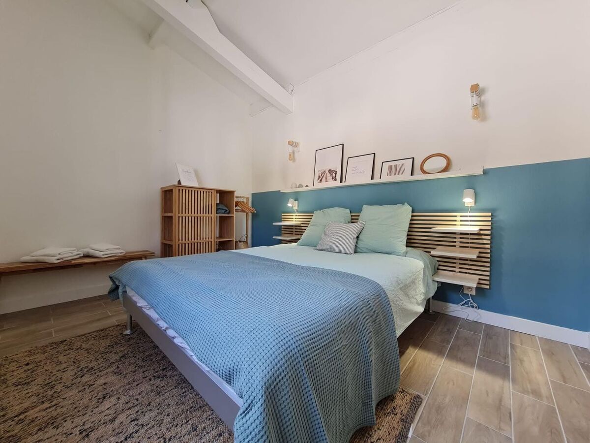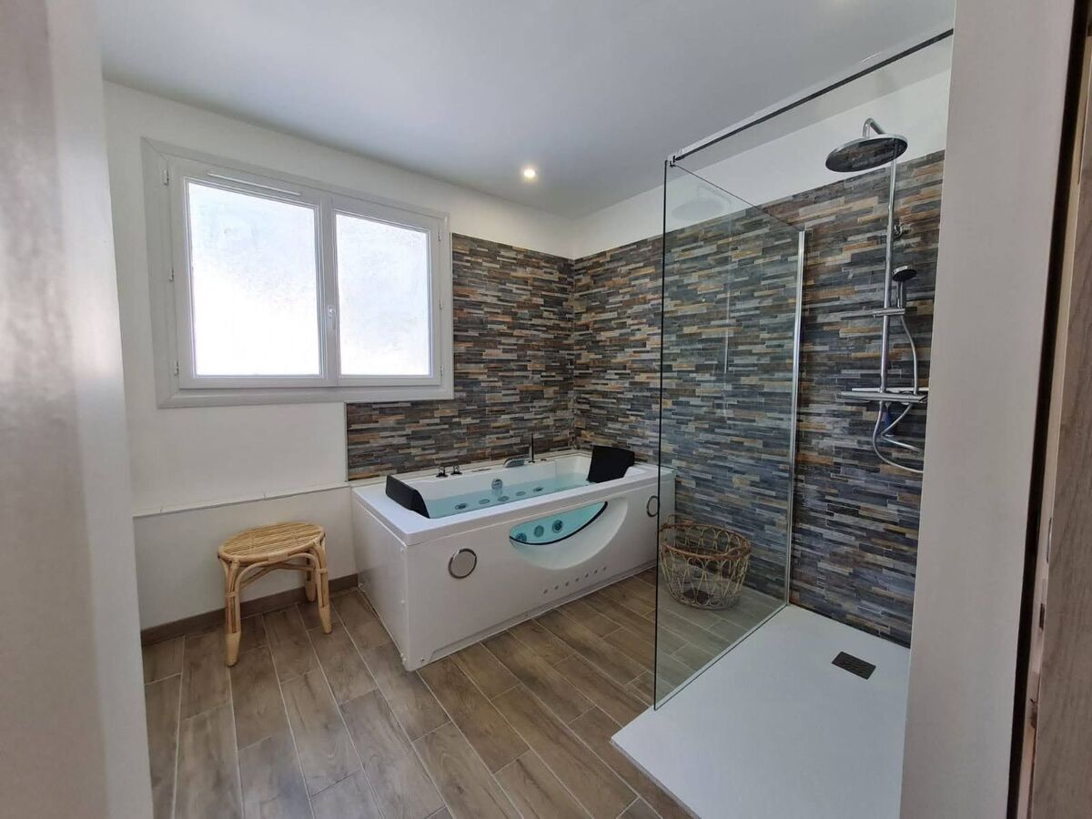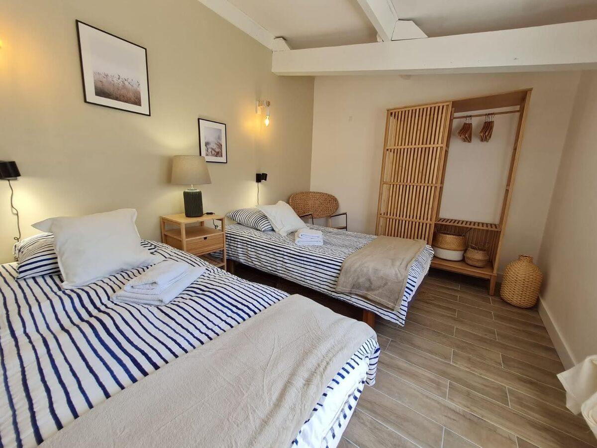 82m² pour 7 personnes Spacieux et très lumineux, grand séjour avec cuisine américaine toute équipée (plaque de cuisson, four, micro-ondes, réfrigérateur, cafetière électrique, grille-pain, lave-vaisselle) et salle à manger, deux chambres doubles (1 x lit double et 1 x 2 lits jumeaux) et une chambre communicante avec un lit gigogne, salle de bains avec douche, baignoire balnéo, WC séparé.