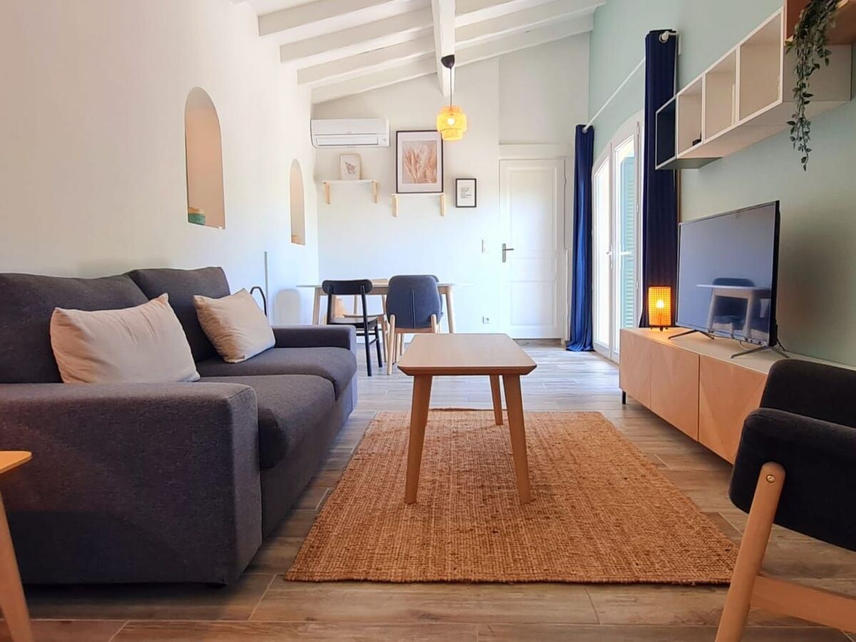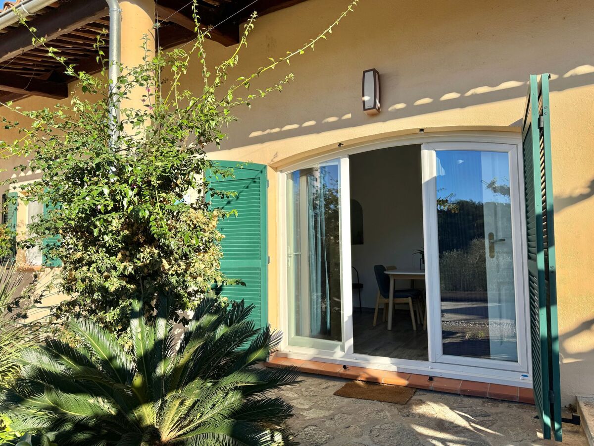 Terrasse ombragée privative avec table et 4 chaises et parasol donnant sur le terrain de pétanques et avec vue sur la mer.