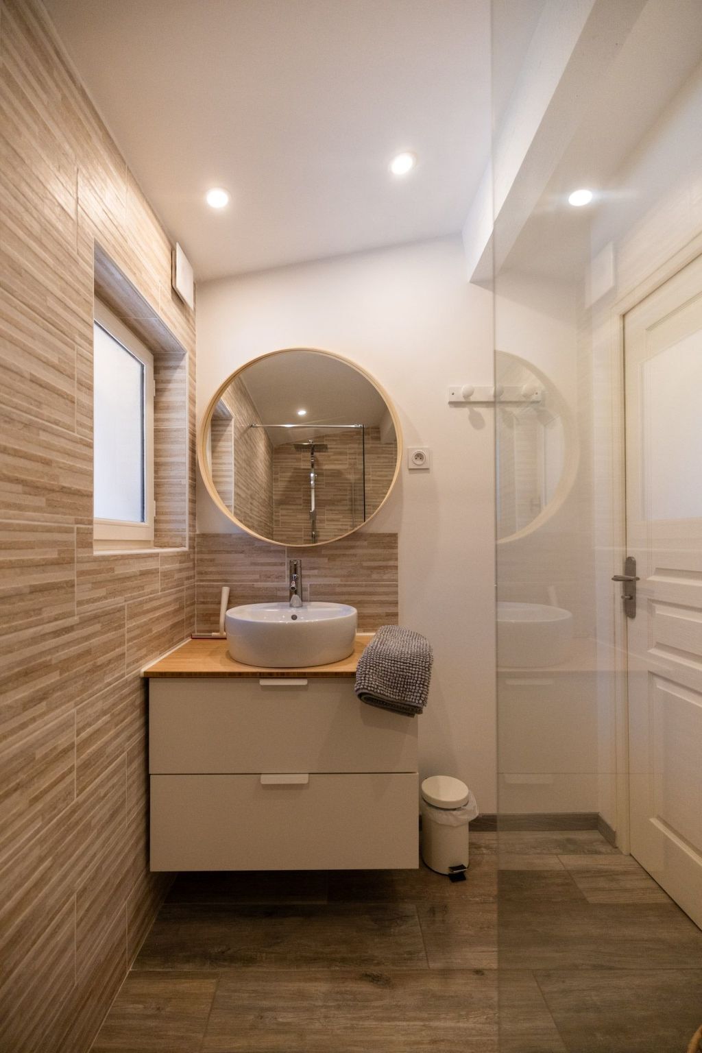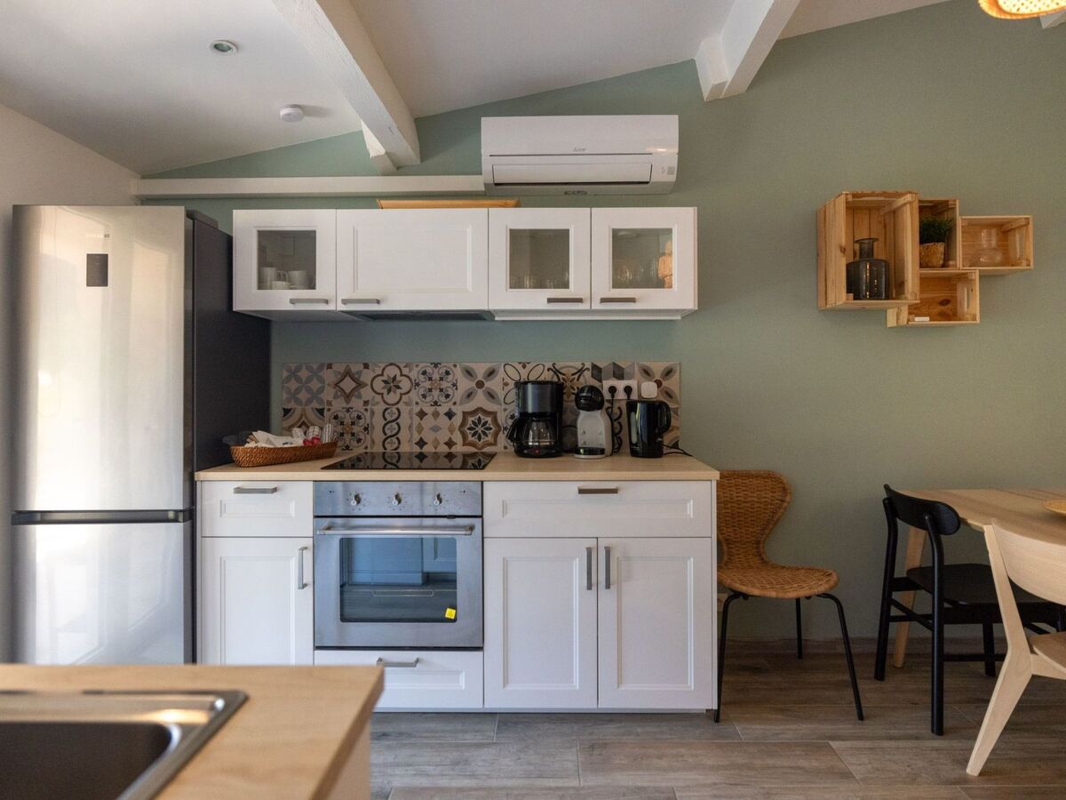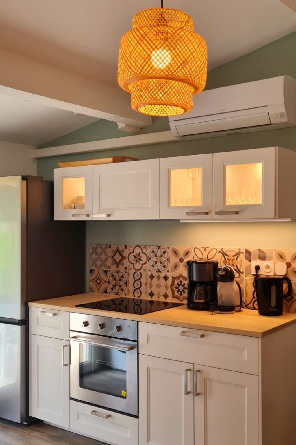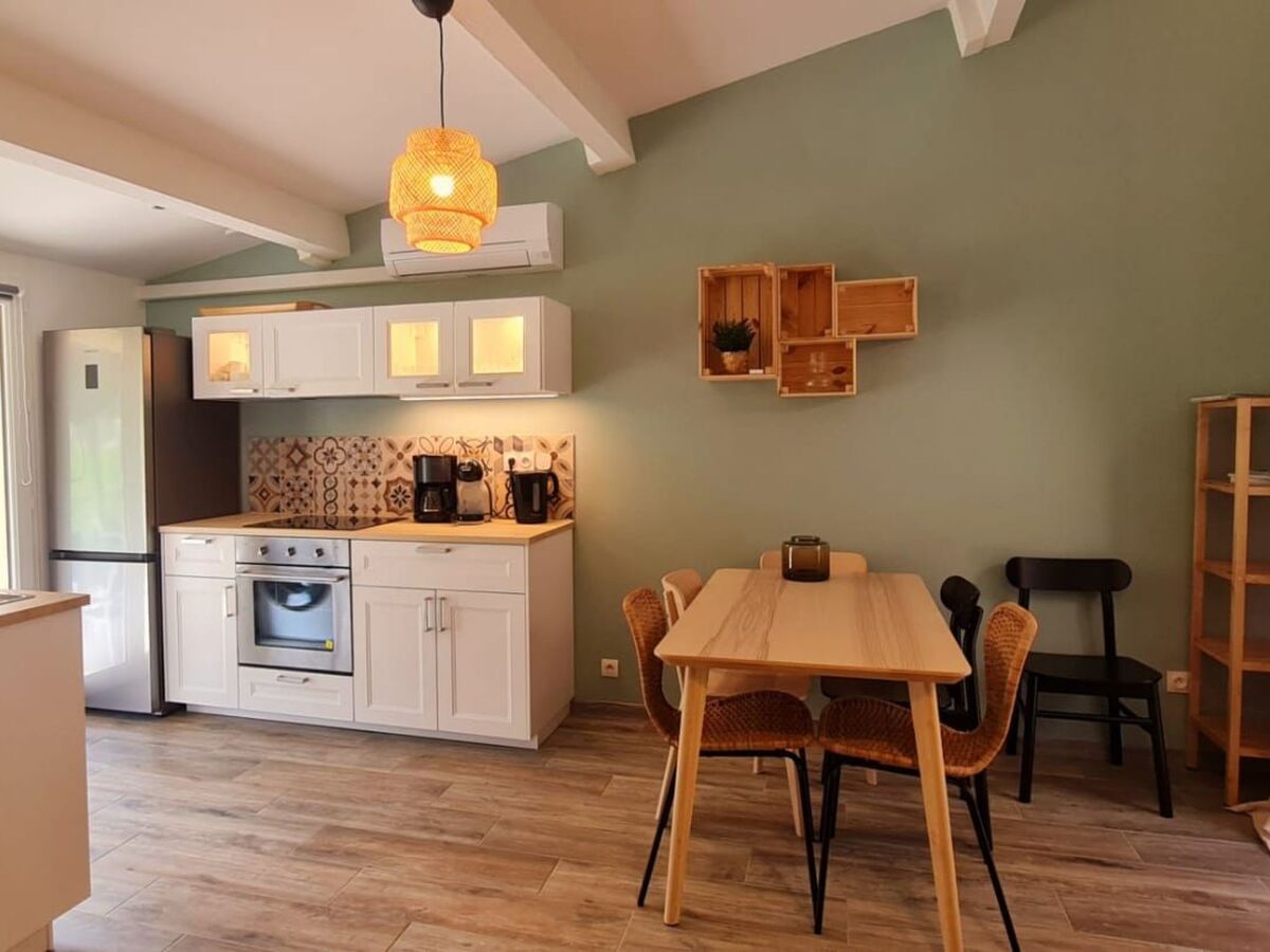 Très agréable gîte comprenant une cuisine américaine toute équipée (plaque de cuisson, four, micro-ondes, réfrigérateur, cafetière électrique, grille-pain, lave-vaisselle), un salon équipé d’un canapé-lit, une chambre double (lit queen size), une chambre double communicante (2 lits simples), une salle de bains avec douche et WC.