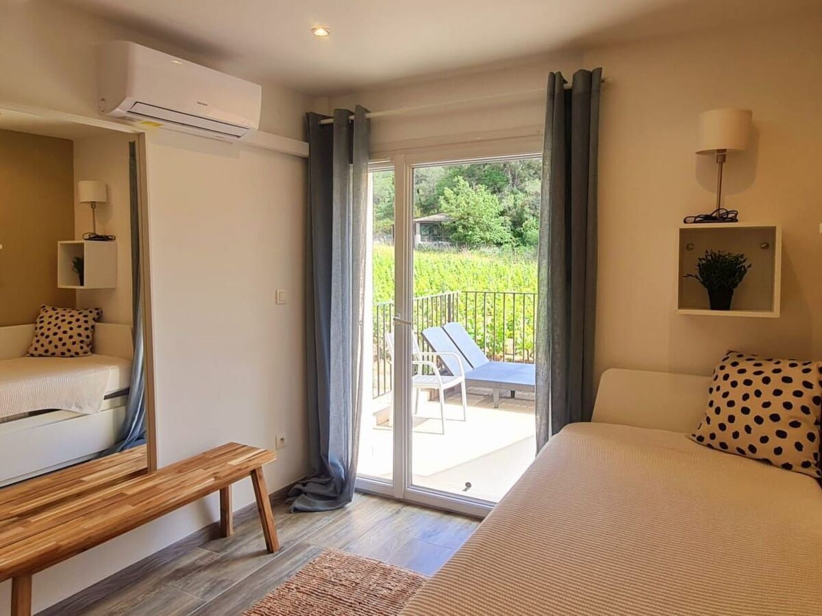 Grande terrasse privative avec table et chaises et parasol donnant sur les vignes.