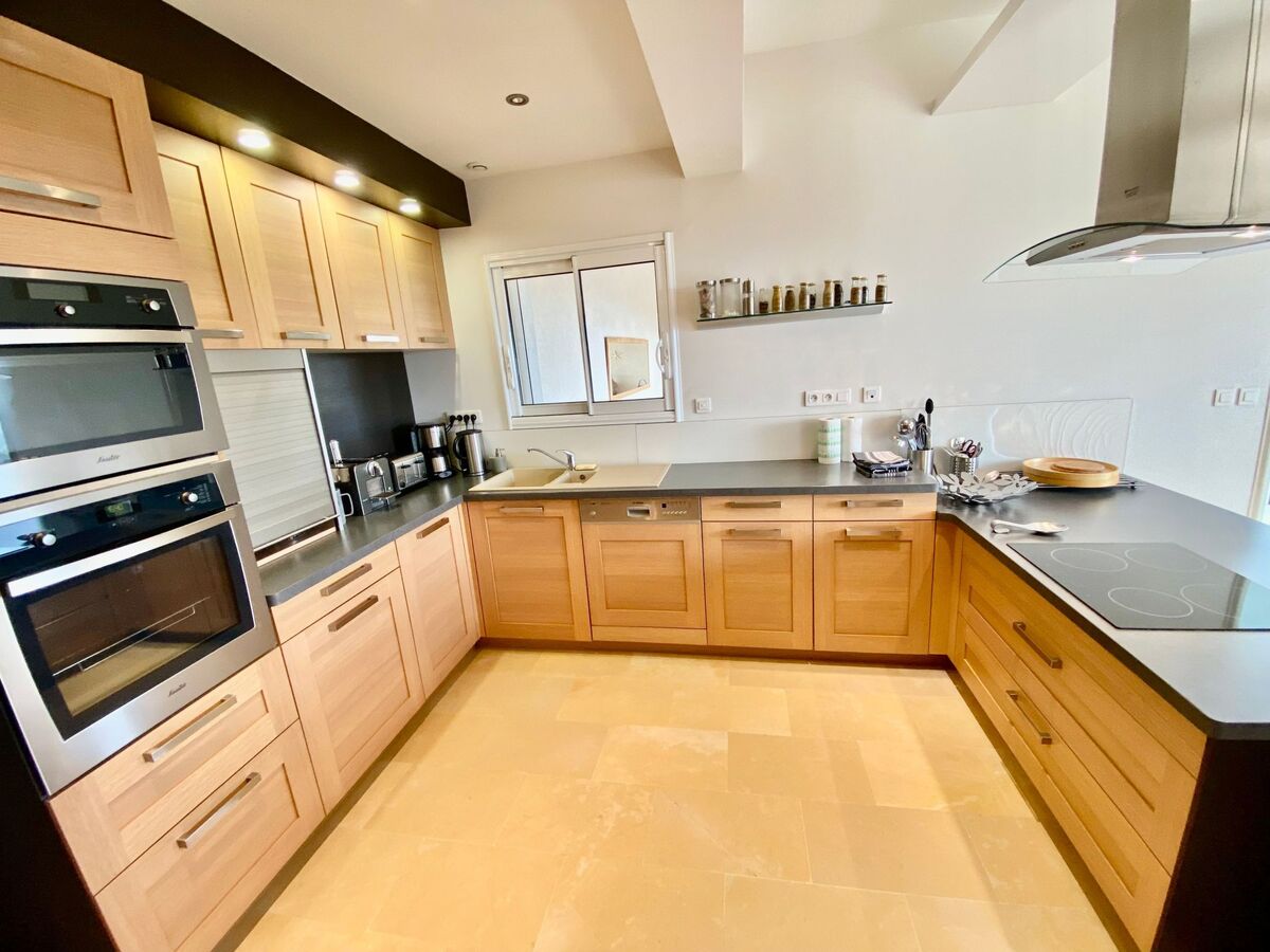 En enfilade vous trouverez le salon, la salle à manger et la cuisine.Toutes les pièces ont vue sur la mer.On y découvre des matériaux de belle qualité pour mettre l’accent sur votre confort.Cette villa accueille 10 personnes.