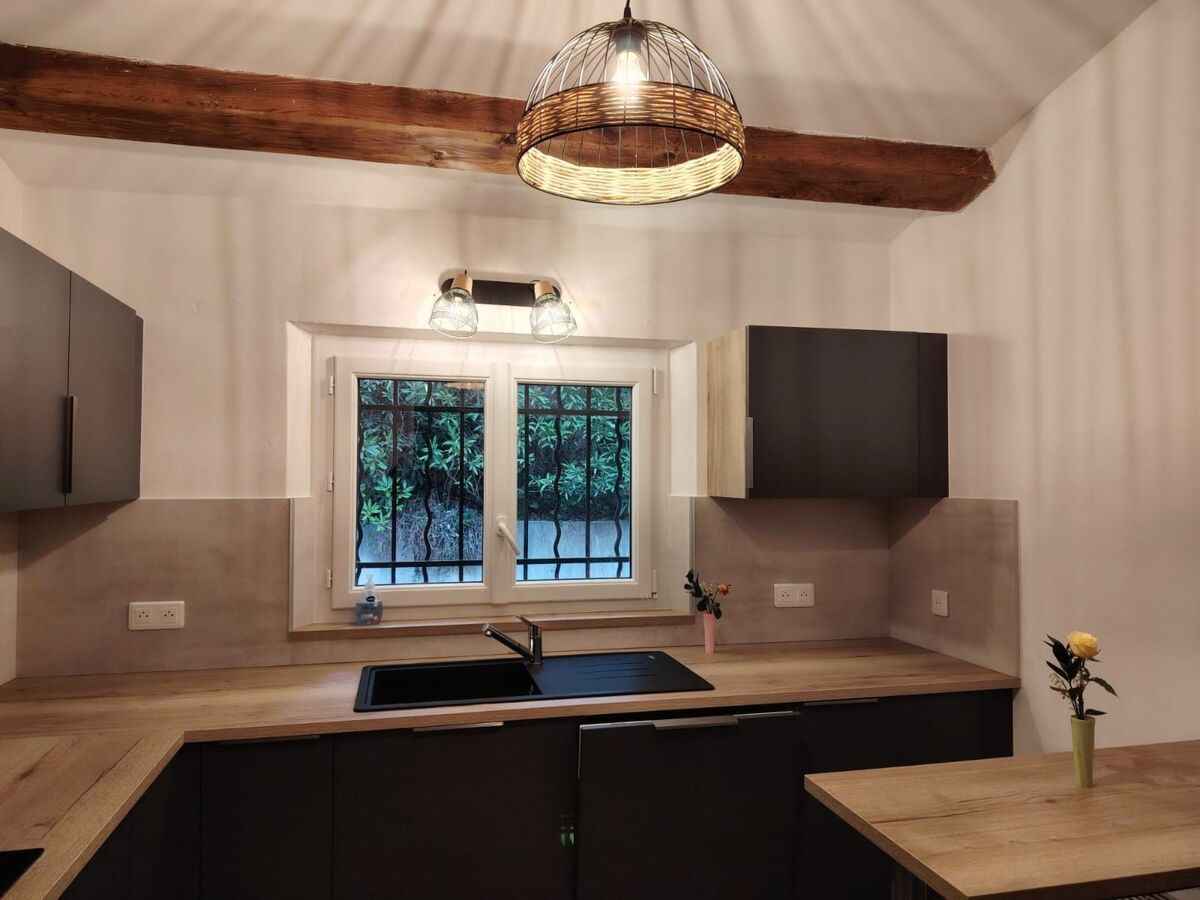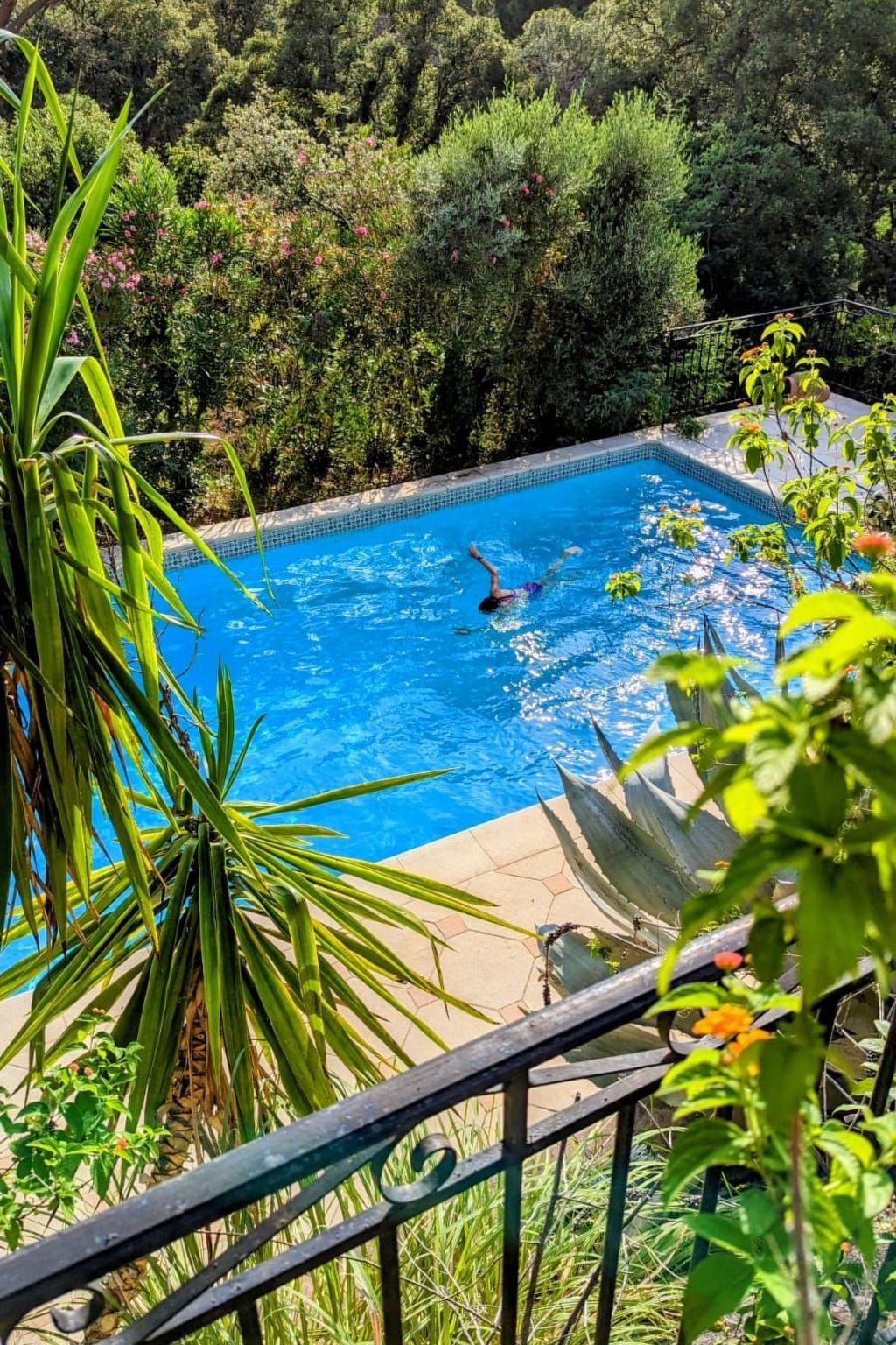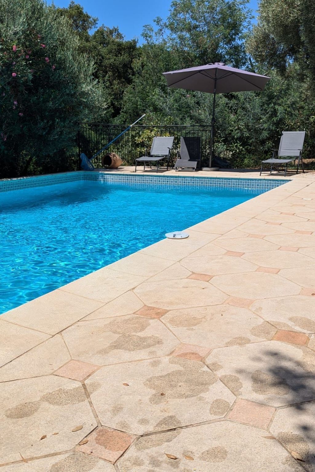 It is surrounded on three sides by a wide stone terrace with comfortable loungers, is idyllically surrounded by Mediterranean plants and trees and is cleaned twice a week.