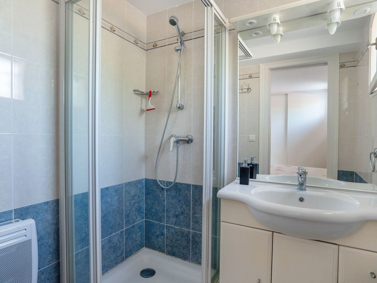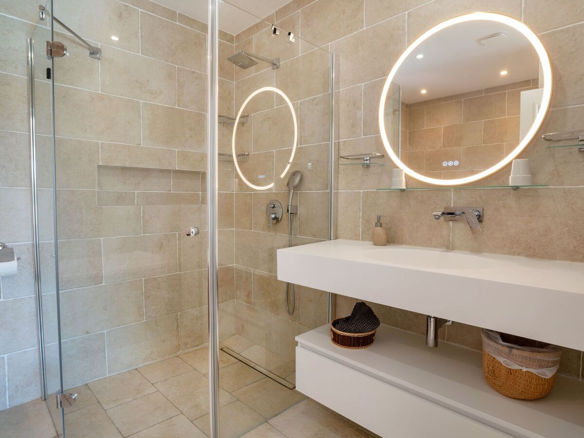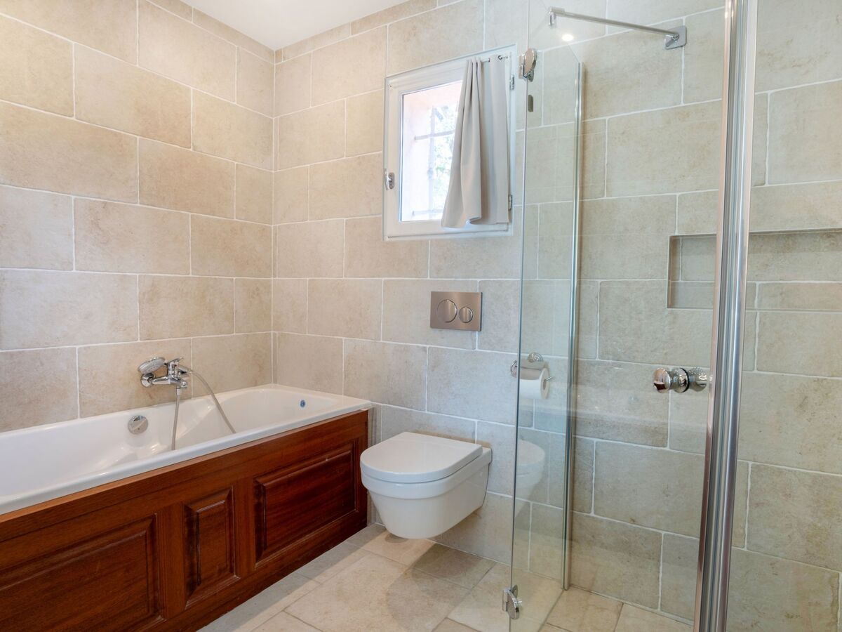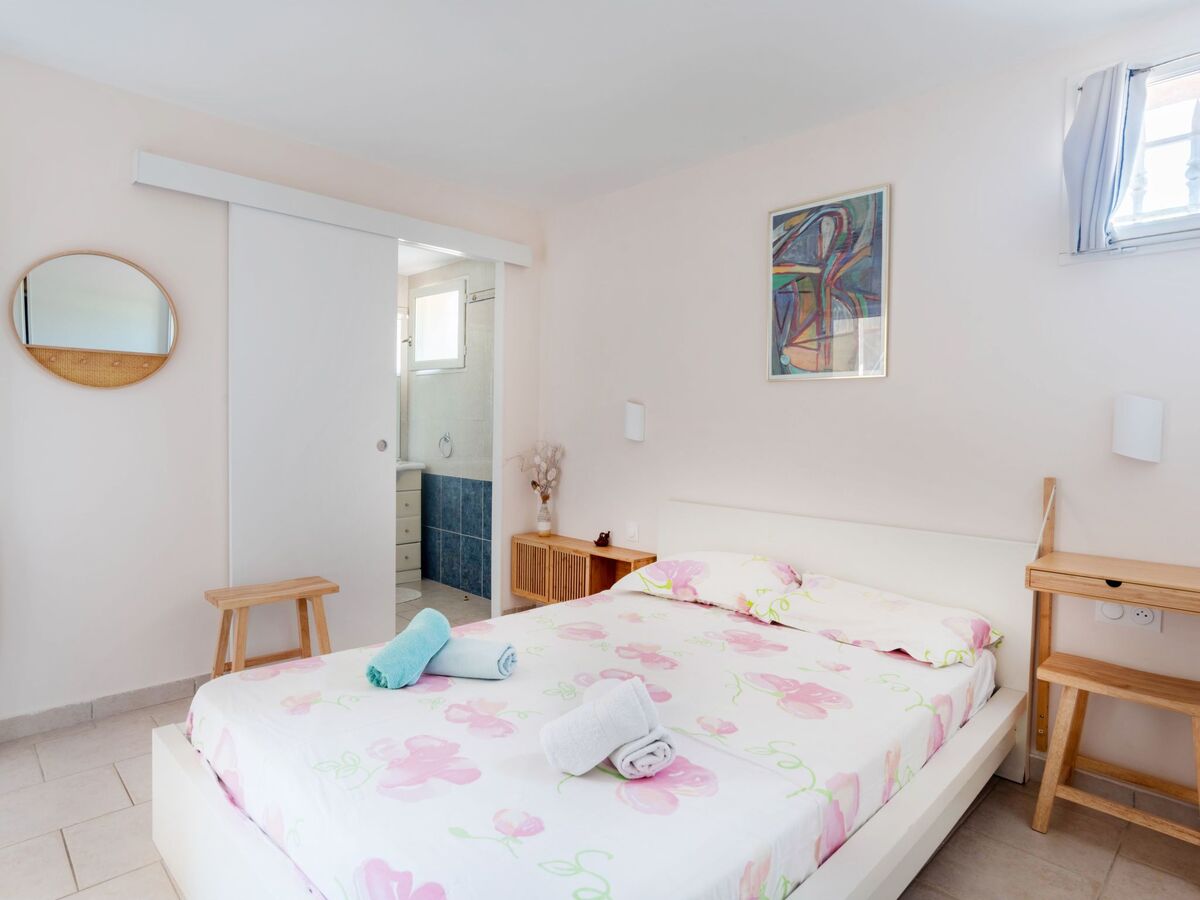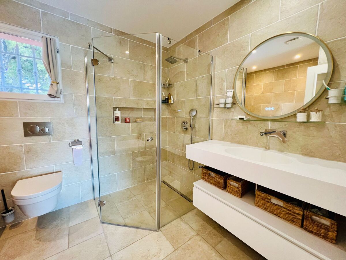 La villa de charme pour deux à six personnes, avec sa piscine privée dans un jardin fleuri clos, dispose d’une première chambre contiguë à la salle de bain avec une baignoire et une cabine de douche, meublée avec une vasque et miroir.