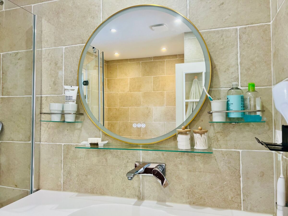 La troisième chambre contiguë à la salle de douche dispose également d’un meuble vasque et miroir.
