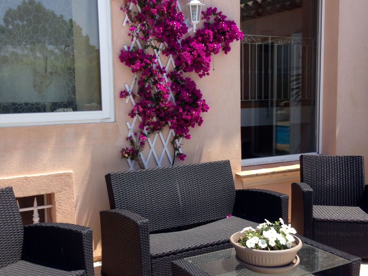 A l’extérieur vous trouverez les Pergolas ombragées, les terrasses avec un salon de jardin et une table en teck pour huit personnes, une table ronde en fer forgé de cinq personnes, cinq bains de soleil, barbecue, table de ping pong ...