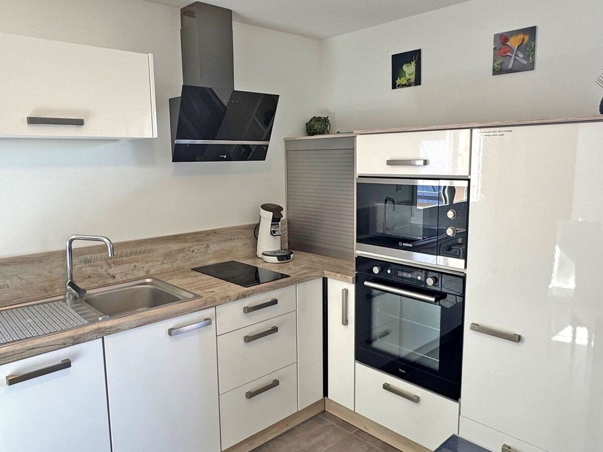 - Pièce à vivre climatisée avec canapé lit rapido (140 cm), table et chaises, meuble TV avec télévision écran plat, cuisine ouverte entièrement équipée (réfrigérateur, congélateur, plaque de cuisson à induction 2 feux, lave-vaisselle, four, micro-onde, vaisselle et ustensiles divers),