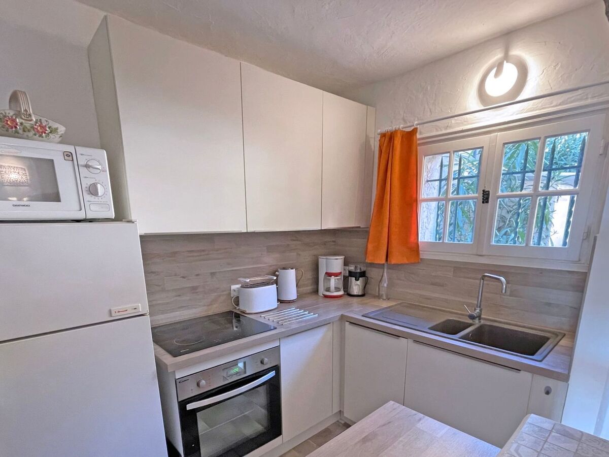 - Entrée avec cuisine équipée : plaque vitro 3 feux, four, réfrigérateur-congélateur, lave-vaisselle, machine à café, bouilloire, vaisselle et ustensiles divers