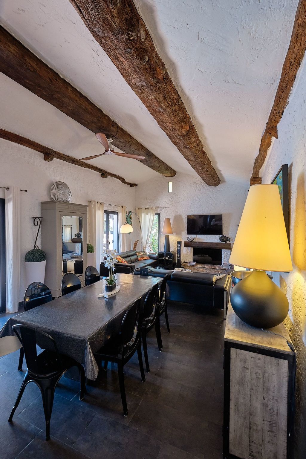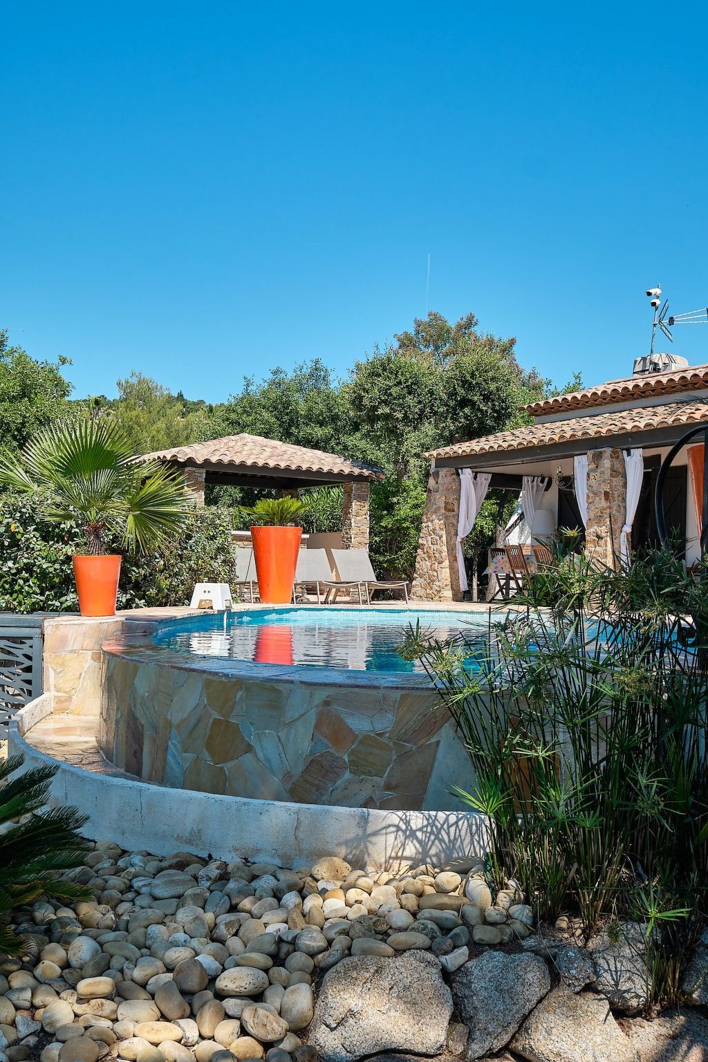 Elle est exposée plein Sud et donne sur la piscine à débordement.