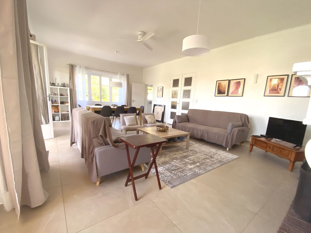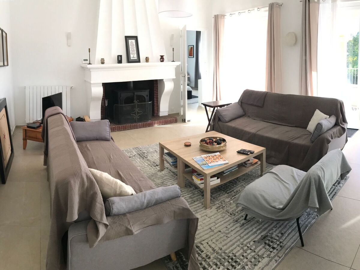 La vie commune se déroule dans le grand salon bénéficiant d'une belle lumière naturelle, s'ouvrant sur le jardin et accédant directement à une vaste terrasse - le cadre parfait pour des repas en plein air.