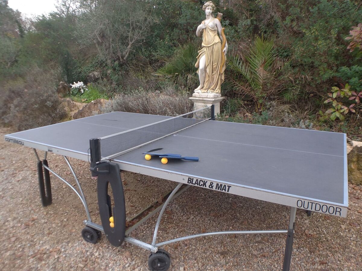 Table de ping-pong extérieure et espace pour les exercices de fitness en plein air.