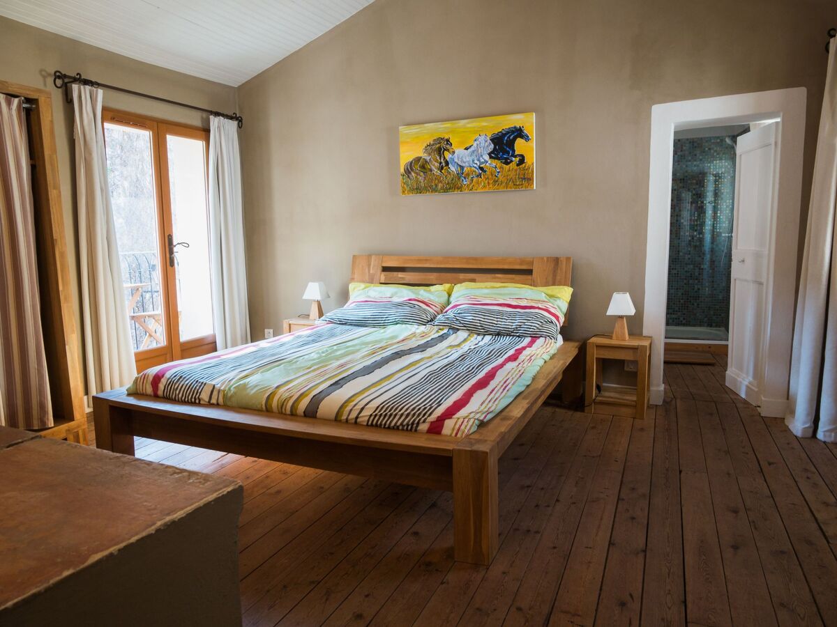 Une chambre à coucher rayonnante avec un lit double, une armoire et une salle de bain attenante à côté d'un WC séparé se trouve à l'étage supérieur, tandis que le sous-sol abrite une autre chambre à coucher avec des lits superposés (pour 3 enfants maximum) WC, douche et machine à laver.