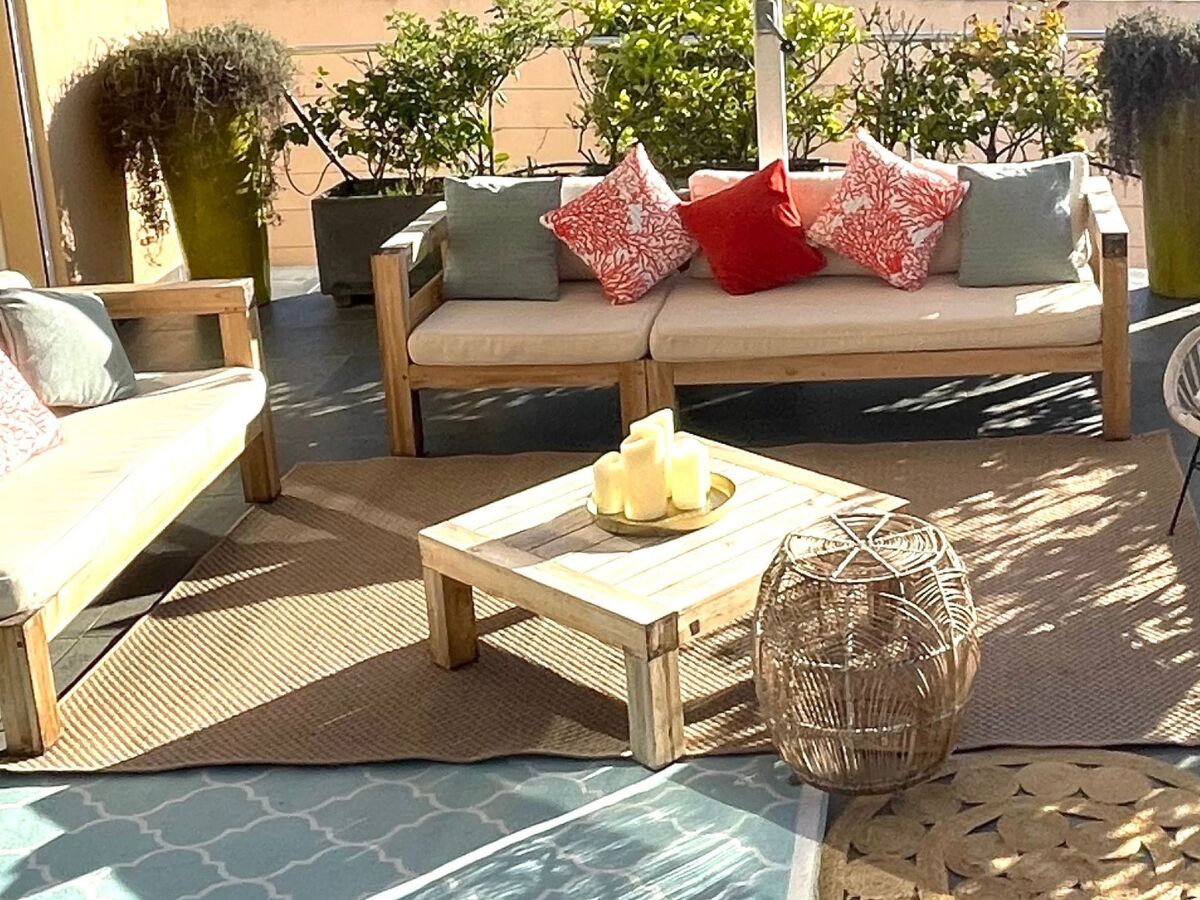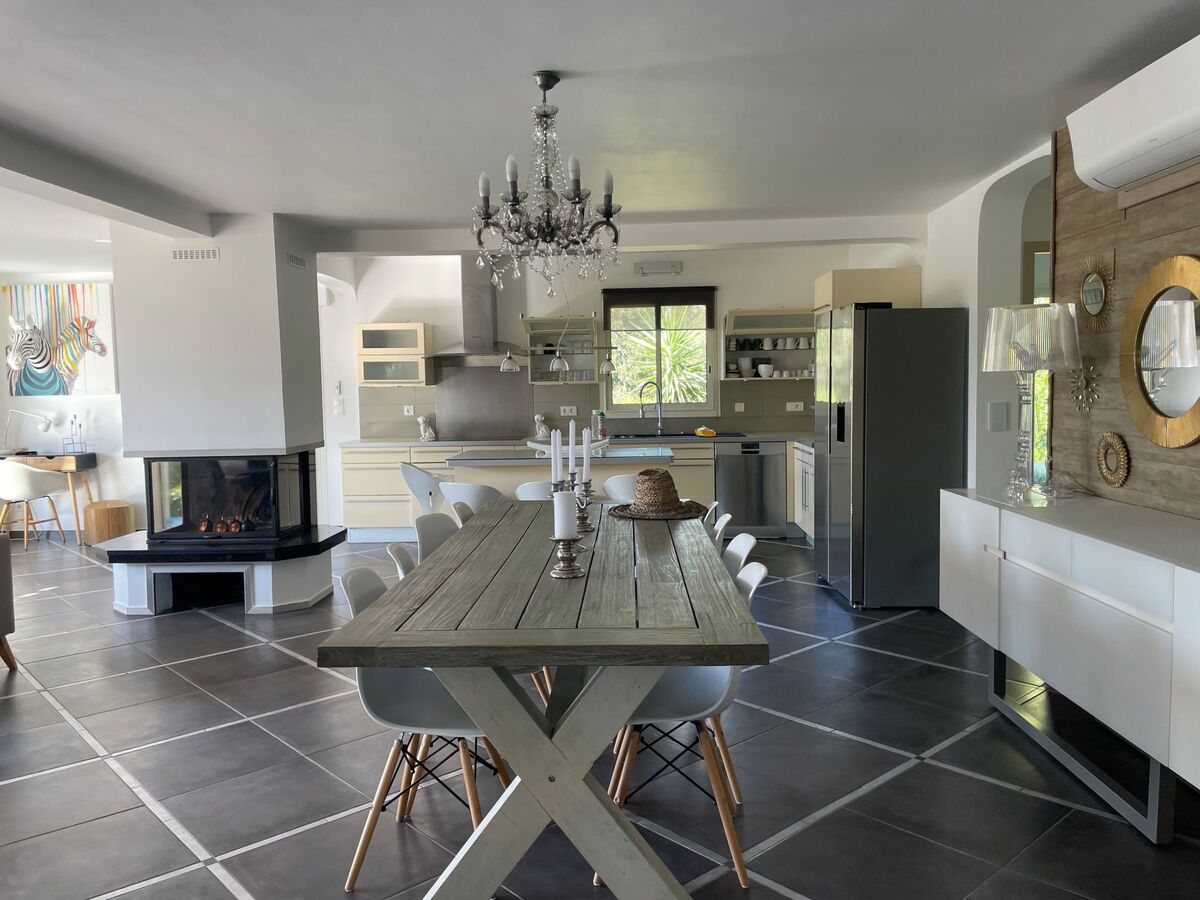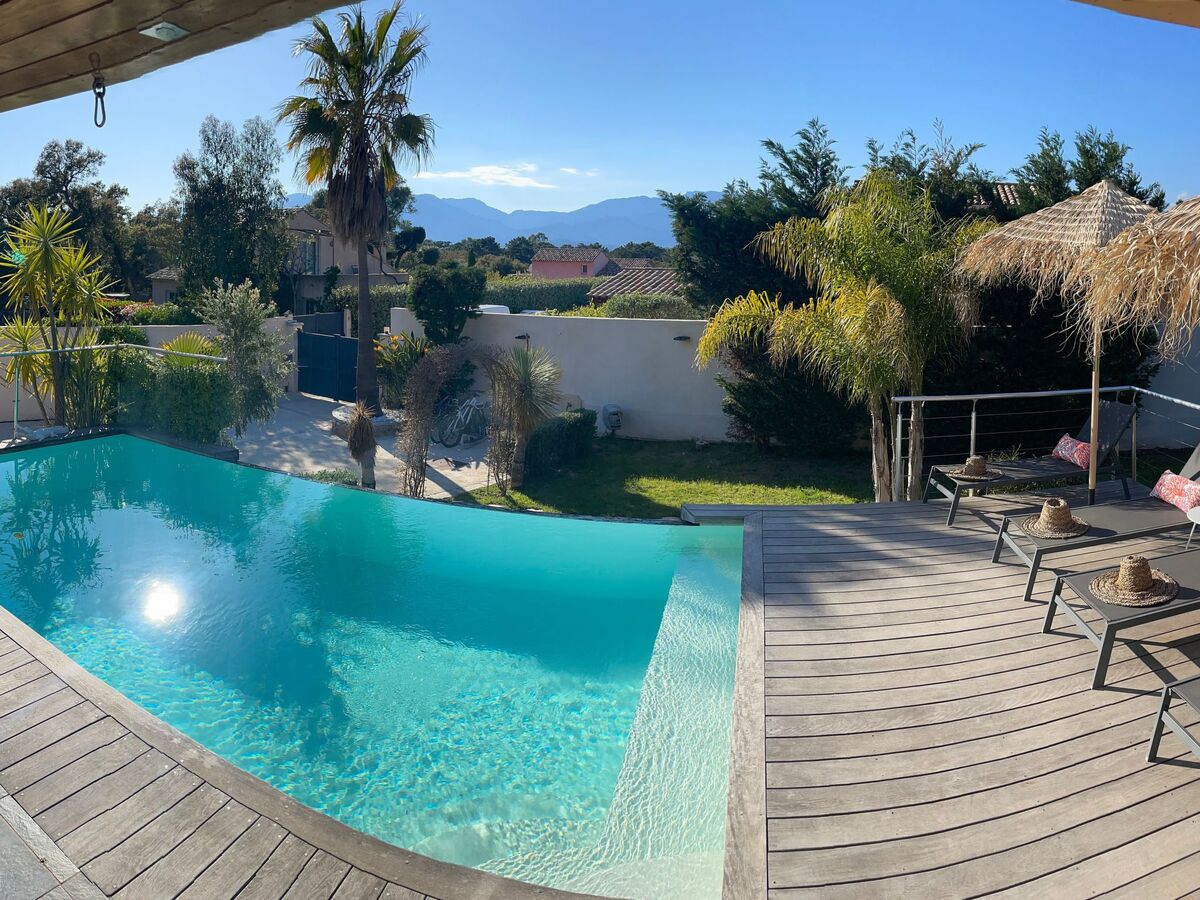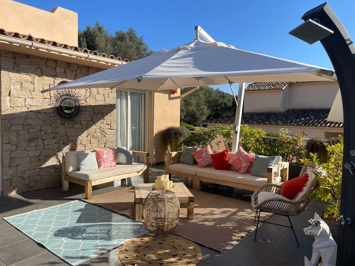 Terrain privatif et terrasse toute équipé de son mobilier: transats, tables, chaises, salon d'extérieur et pergola ainsi qu'un pool house entièrement équipé avec TV et cuisine extérieure.