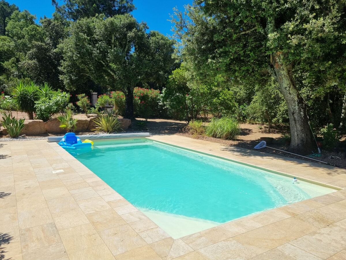 Une grande terrasse couverte de 60 m2 est équipée d'un barbecue, d'une plancha électrique et d'un coin cuisine aménagée extérieur avec salon d'extérieur donnant sur un jardin privatif arboré de 3800 m2 (pins, chênes, arbousiers, bruyères).