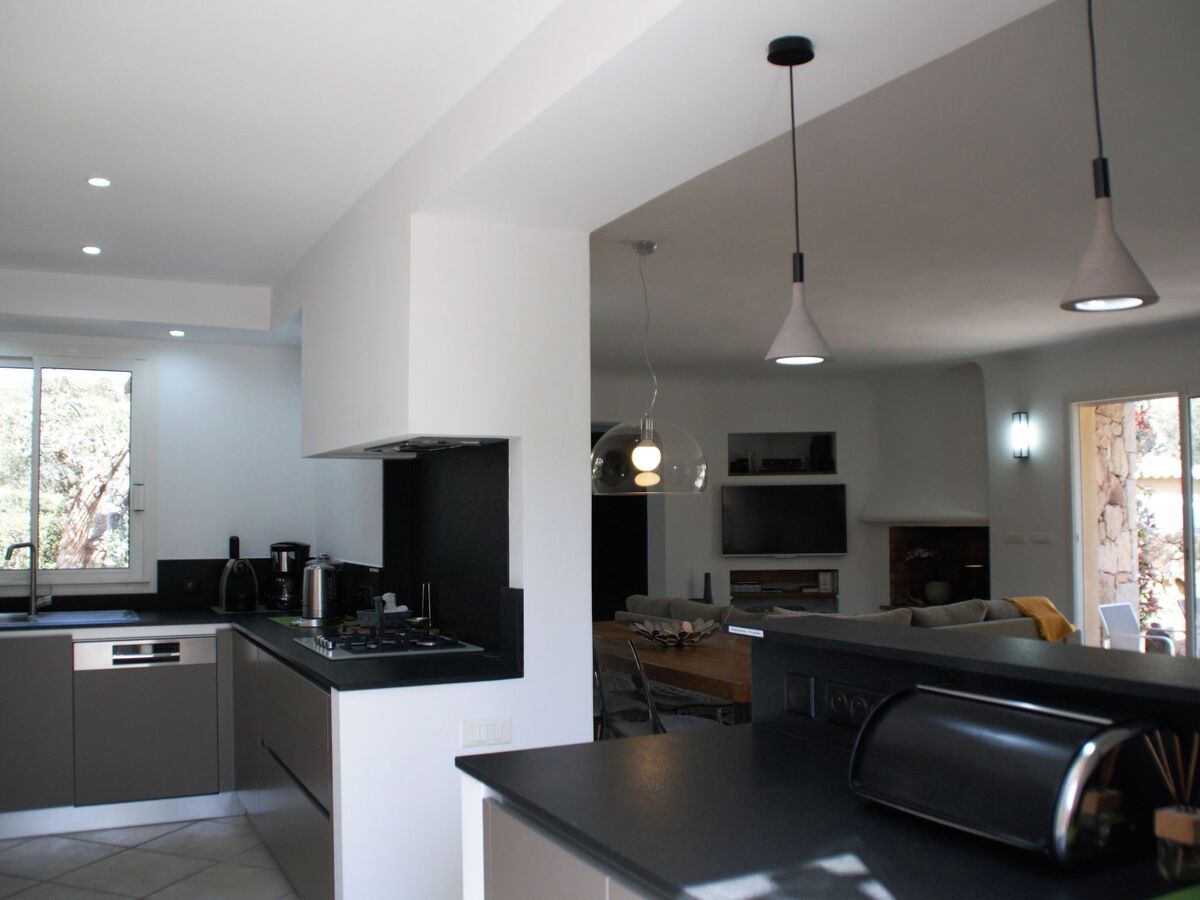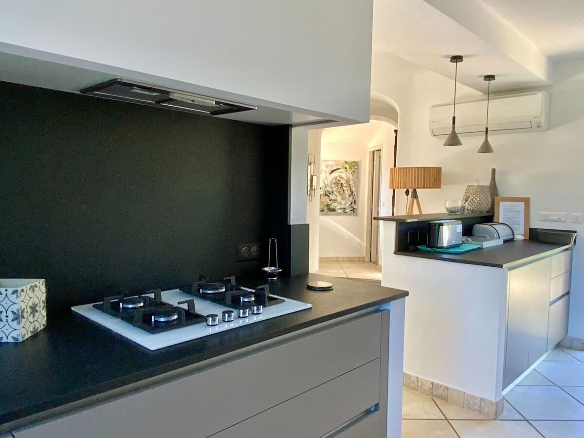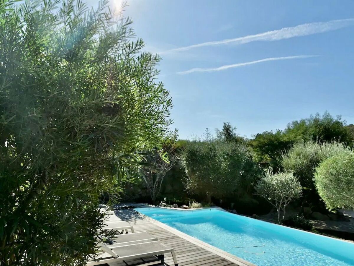 Piscine sécurisée par un rideau électrique, Plage en IPE, Bain de soleil haut de gamme, douche extérieure, cuisine d'été entièrement équipée.