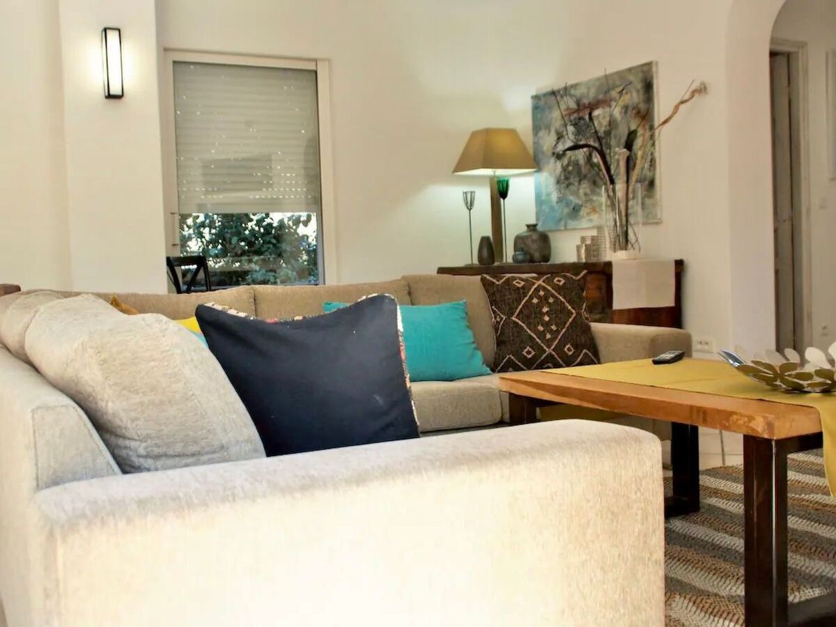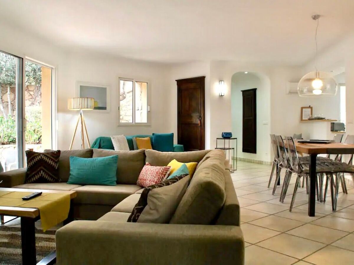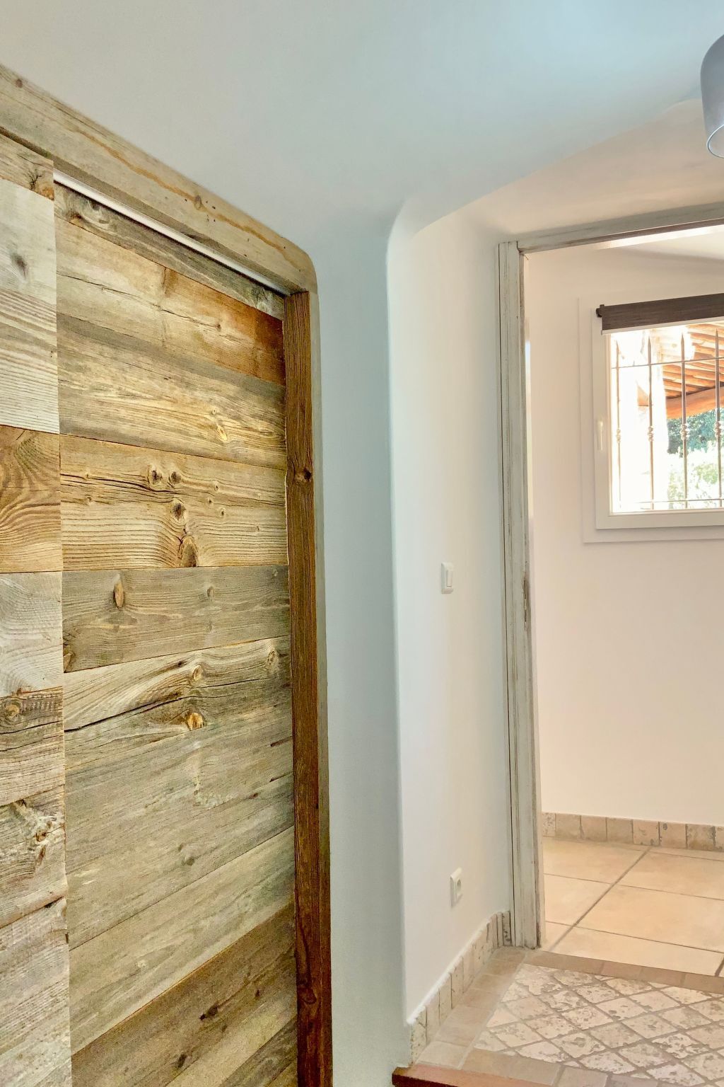 Au rez de chaussée se trouve le salon avec un grand canapé d'angle, un deuxième canapé-lit, cuisine + buanderie avec une porte en galandage donnant sur une terrasse, un couloir menant à la chambre matrimoniale dans sa plus grande intimité, avec sa salle d'eau/WC privée, clim, TV led ; sa particularité est sa sortie vers l'extérieur par une porte en galandage.