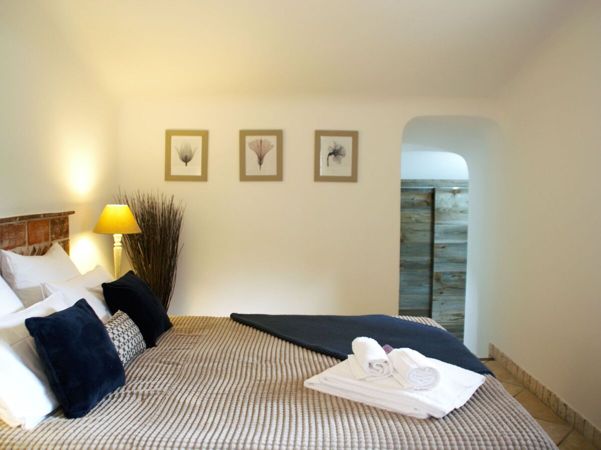 A l'étage se trouve 1 chambre avec un lit en 180, Sa salle de bain baignoire balnéothérapie/ WC, clim, Smart TV