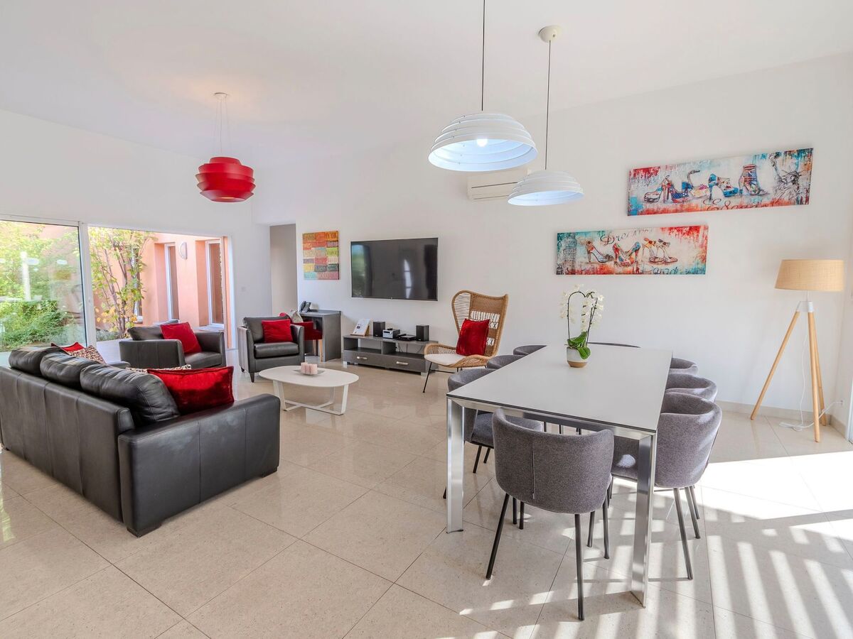 La pièce à vivre additionnelle de 65 m² est baignée de lumière, complétée par une salle à manger pouvant accueillir 12 personnes et une cuisine ouverte fonctionnelle.