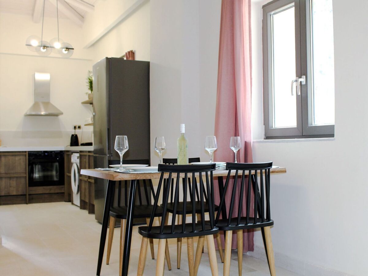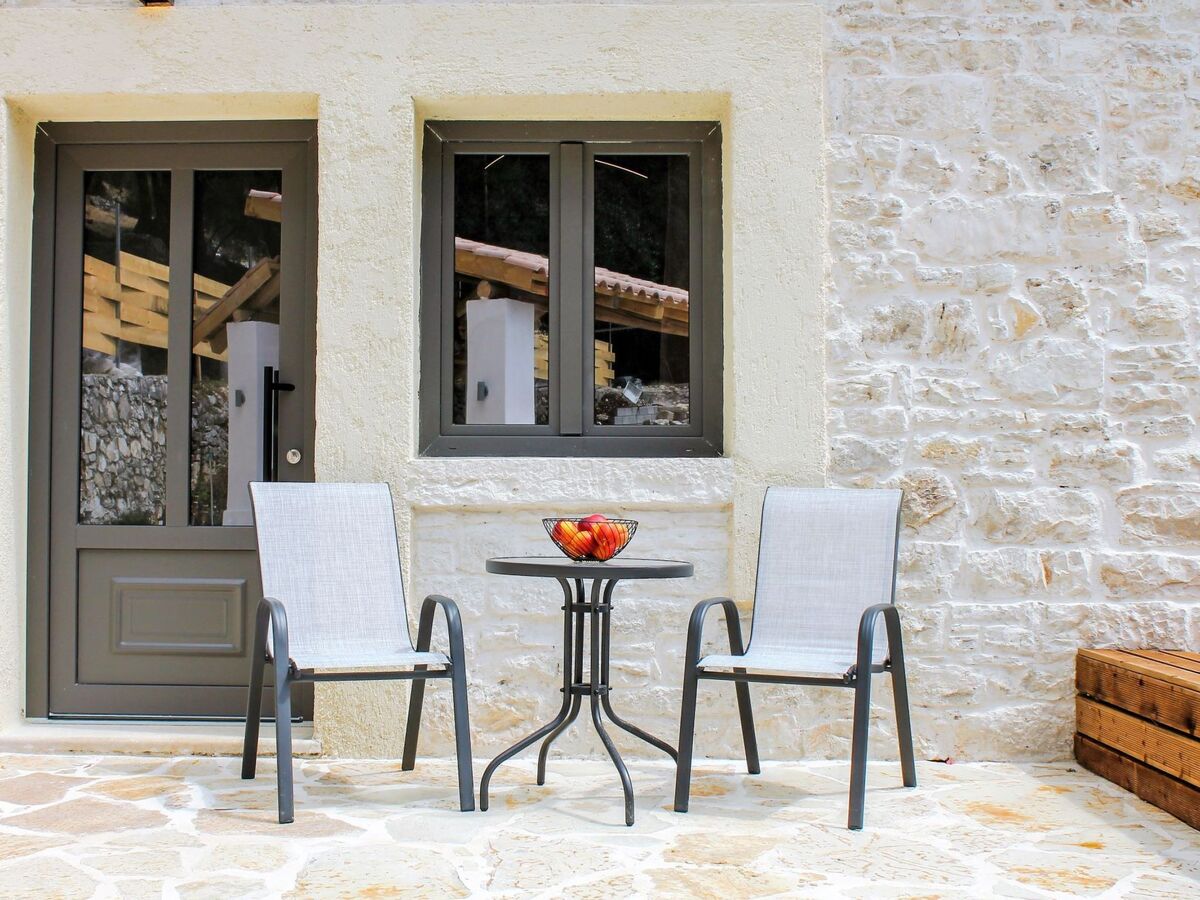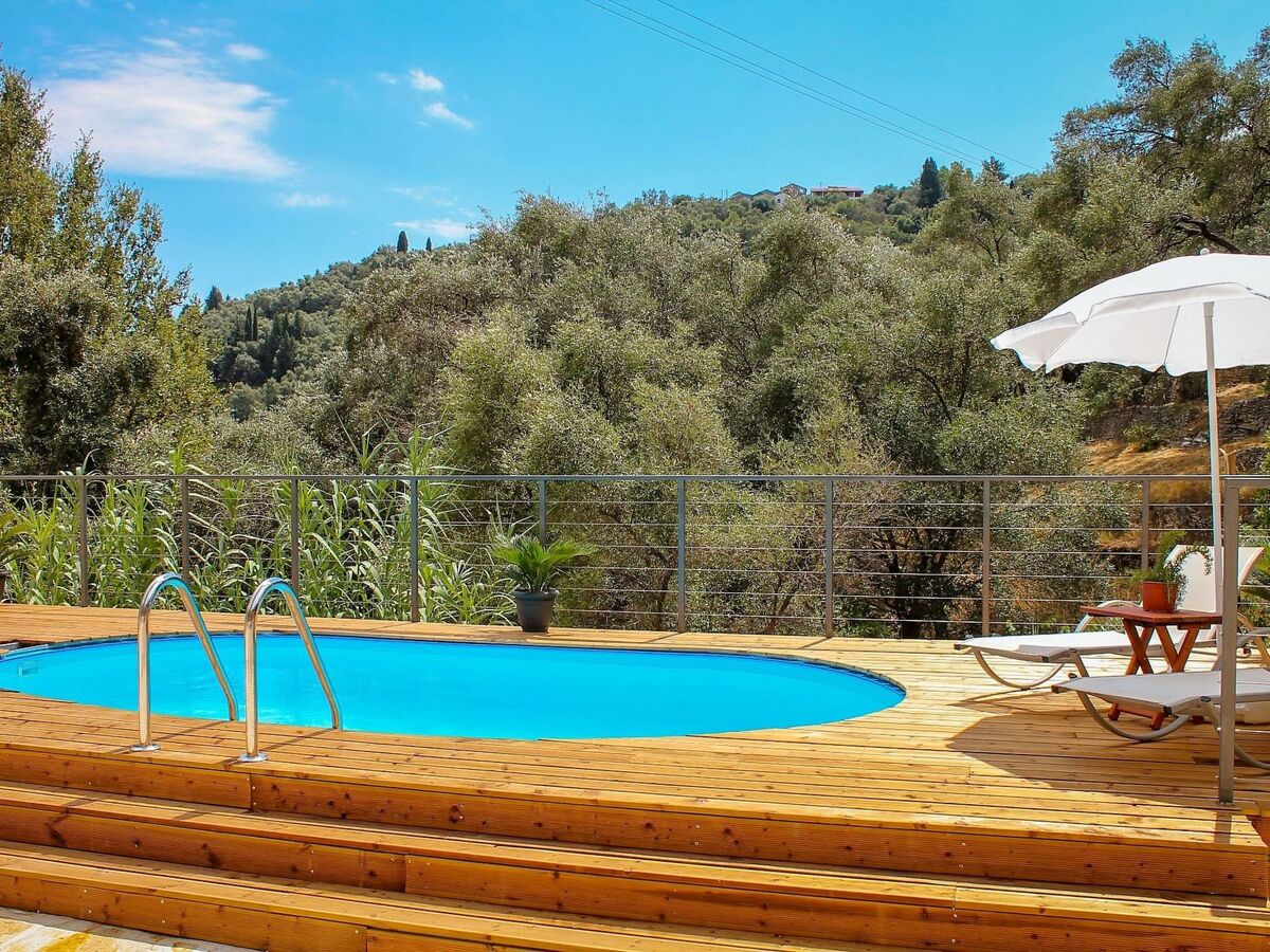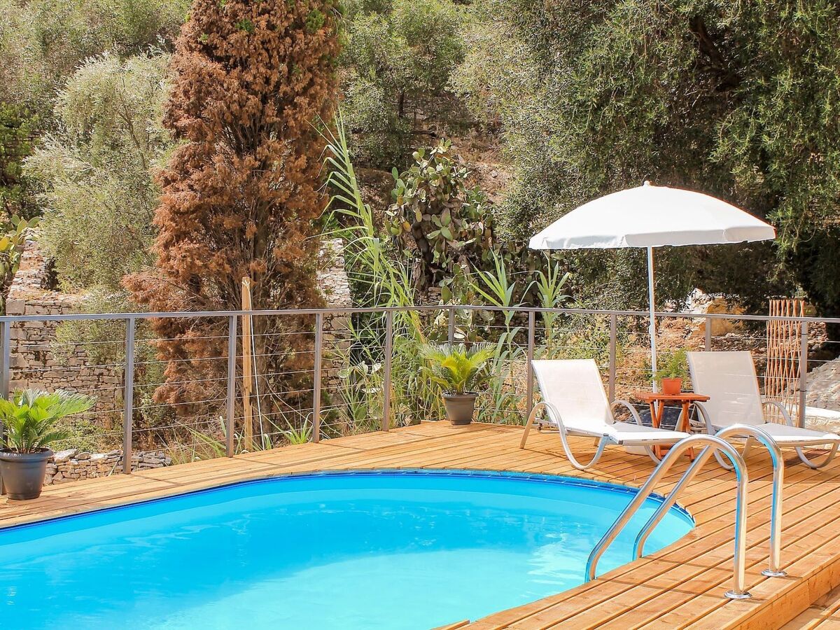 Right next to it there is the house's swimming pool, with sunbeds and a wooden deck.The pool is right next to the stone-built house by the central entrance.The central door leads into a large living room with a sofa and a smart TV, as well as a dining table and a fully equipped kitchen.There are another two bedrooms in the villa, each with a double bed and air conditioning system.