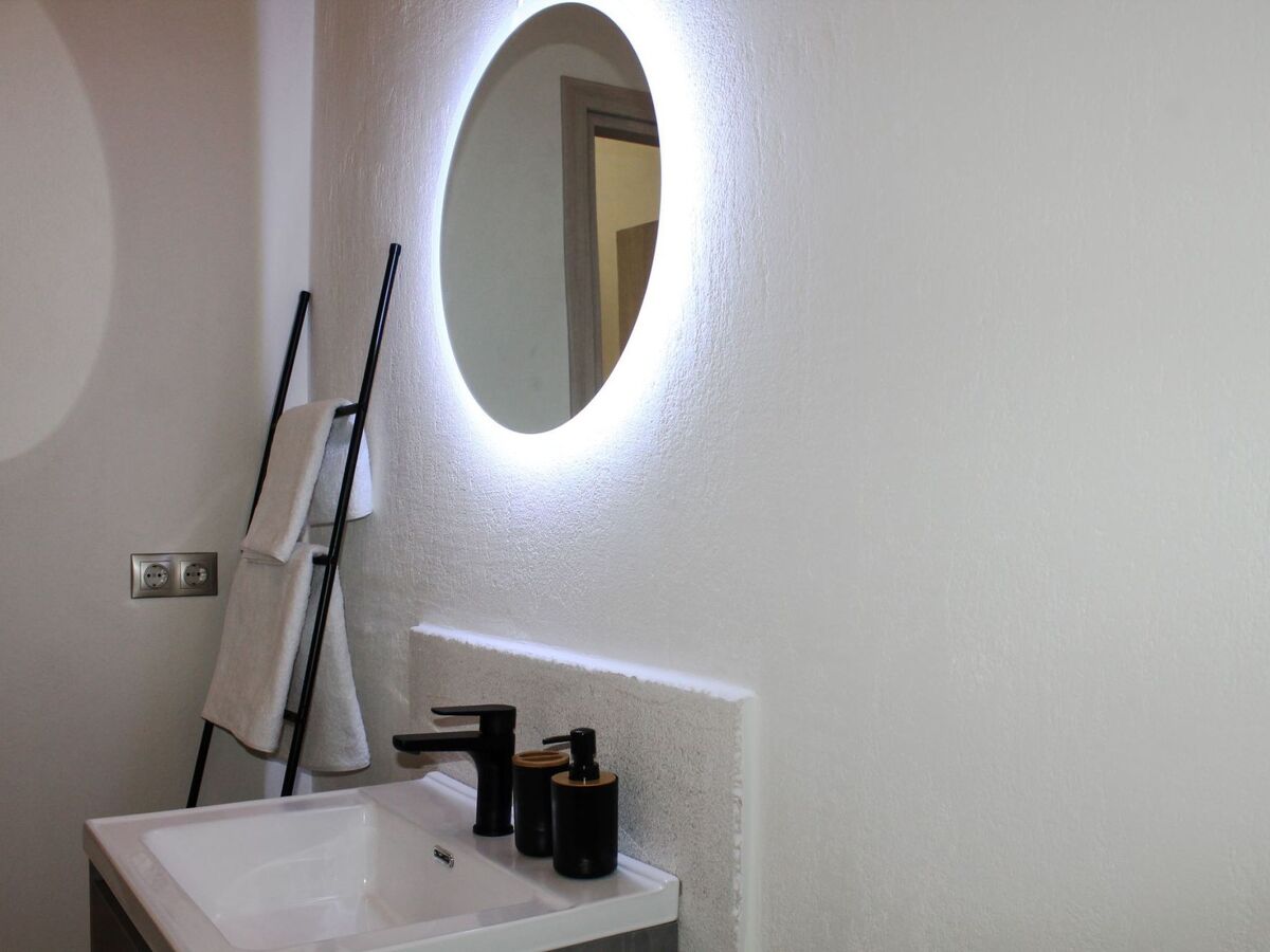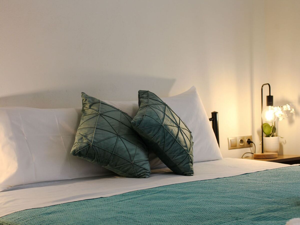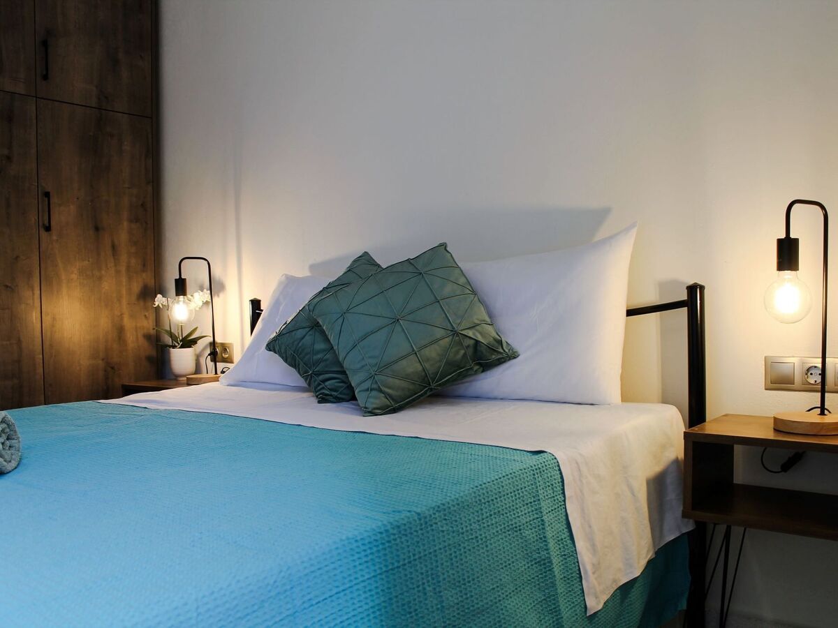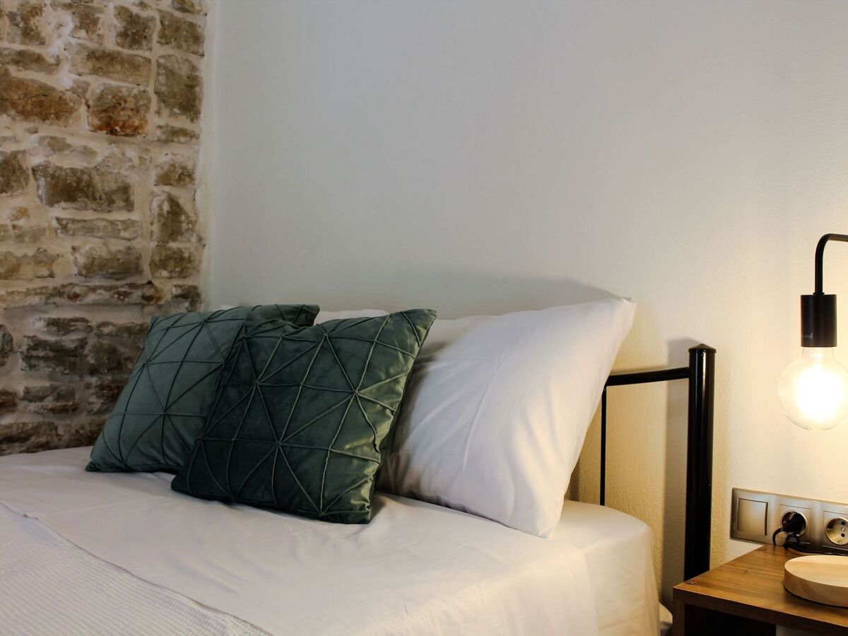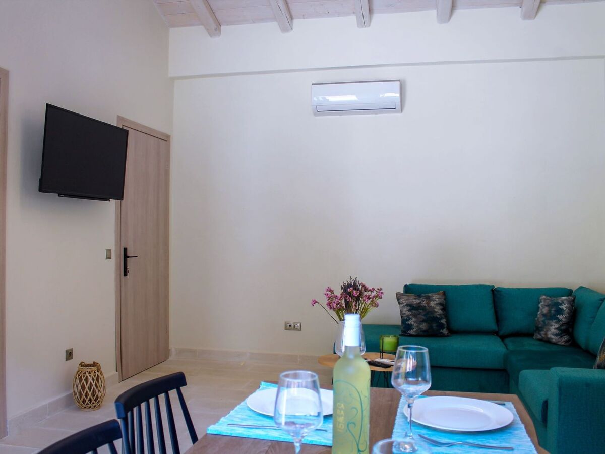 Right next to it there is the house's swimming pool, with sunbeds and a wooden deck.The pool is right next to the stone-built house by the central entrance.The central door leads into a large living room with a sofa and a smart TV, as well as a dining table and a fully equipped kitchen.There are another two bedrooms in the villa, each with a double bed and air conditioning system.